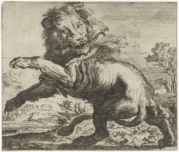 Editor: This is Antonio Tempesta’s "A Lioness Attacking a Horse," made around the late 16th or early 17th century. The level of detail achieved through engraving is pretty amazing. What can you tell me about this work? Curator: Consider the labor involved in creating this small, intricate print. Each line was carefully etched, demanding time and skill. How does that influence your understanding of its value as an object? Editor: So, more than just the image itself, the value lies in the intense labor of its production? Curator: Precisely. And what does the mass production of prints mean for the art market, historically? Was this readily available or exclusive? Editor: I guess it democratized art but maybe devalued the original work. Curator: Exactly! Food for thought.