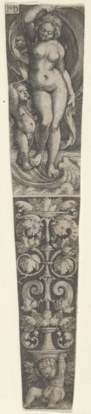 Curator: This engraving from 1528 is by Heinrich Aldegrever, titled "Design for a Sheath with the Whore of Babylon." The detail is quite impressive, even on such a small scale. Editor: It's so intricate! I am fascinated by the nude figure at the top holding what looks like a chalice, but how does this design, meant to be applied on a sheath, serve its function? Curator: Precisely! Think about the cultural context and the materials involved. The image would likely have been transferred onto metal through painstaking labor. Aldegrever, influenced by Mannerism, pushes the boundaries of the conventional "high arts" by focusing on prints for artisans. We should be concerned about the consumer’s desire for such images and what the manufacturing process can reveal about class divisions. What does it tell us about consumption? Editor: It makes sense that these would be items made to be sold widely to consumers who have access to finely crafted metal goods, expanding the artwork beyond a privileged elite. What about the subject itself, though, the "Whore of Babylon?" What’s her role in this context? Curator: Consider her role. What does it mean to adorn everyday objects with such potent, loaded imagery? The materials used in creating this functional item elevated it beyond the merely practical. Was this meant as an assertion of power, morality, or maybe even as an ironic statement given that it depicts the “Whore”? What can such images on such items tell us about consumption and social values in the 16th century? Editor: That's such a good question. Perhaps its impact on culture stemmed from the shock value of decorating something so utilitarian with such a symbolically controversial image, sparking discussions around class and morals for people of varying socioeconomic strata! Curator: Indeed. By looking at it in the context of its intended use and how it was made we can start to really unpack Aldegrever's social commentary and also understand its wide-reaching societal influence! Editor: That opens up my perspective. Thanks for encouraging me to think more about this image through the lens of labor, process and manufacturing, and materials rather than simply subject matter!