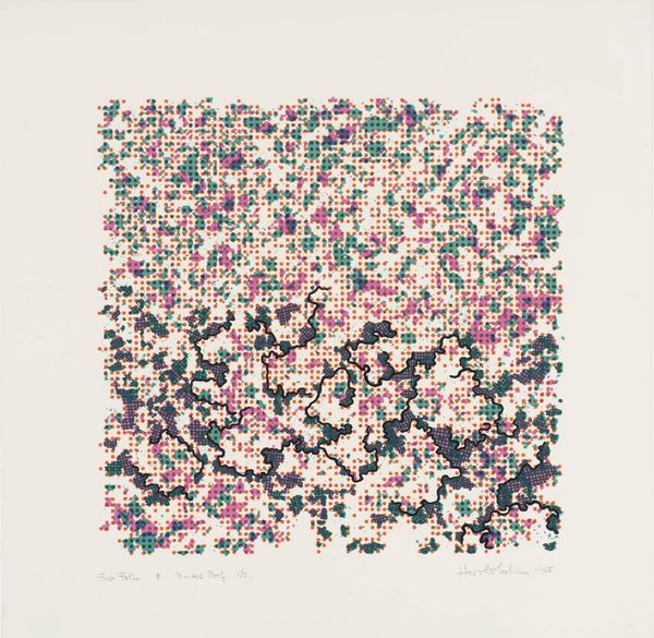 Editor: This is Esq Tom Phillips's "Canto XXX: [no title]" from the Tate Collections. I’m struck by the contrasting colors and the sense of fragmentation. What do you see in this piece? Curator: I see a commentary on the instability of established structures. The grid, a symbol of order, is disrupted by these organic, almost violent, red shapes. Consider how this echoes societal upheaval, where rigid systems are challenged by disruptive forces. Editor: So, the red shapes represent a challenge to the green grid? Curator: Precisely. Phillips might be suggesting that progress necessitates a break from tradition, a dismantling of existing power dynamics, though perhaps with inherent chaos. Editor: That gives me a new perspective on this artwork. Thanks! Curator: It's a pleasure to explore such complex ideas together!