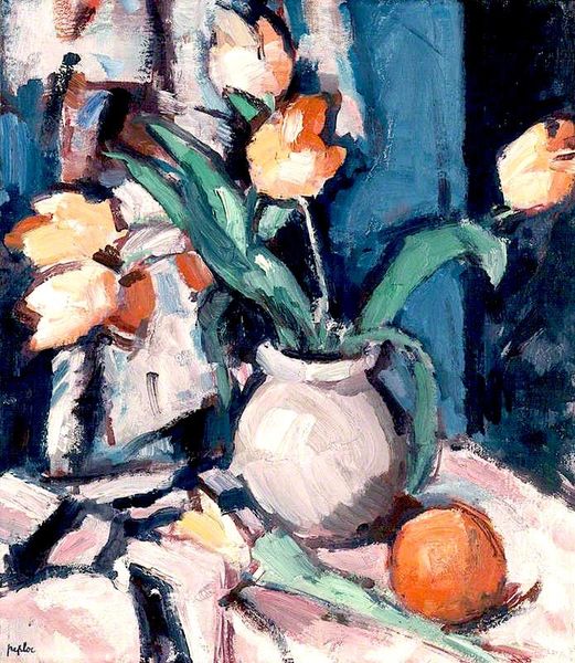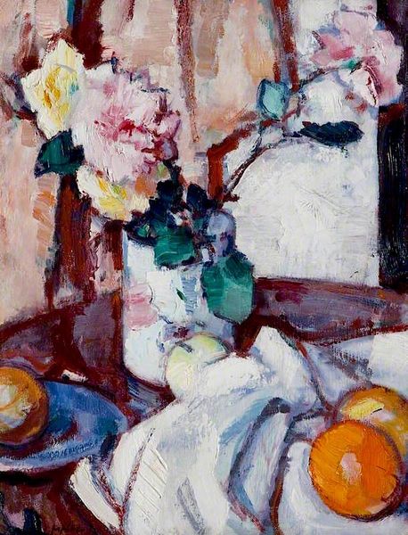 Samuel Peploe's painting, "Roses," captures a striking arrangement of color and form, achieved with oil on canvas. Notice the white vase, a solid structure, anchoring the composition amid a whirlwind of cool blues and greens. The impasto technique is evident in the expressive brushstrokes that capture the fleeting essence of the roses. Peploe’s technique reduces forms to their most essential, almost abstract qualities, as you can see in the contrasting strokes of black against the stark white. Peploe challenges our perception of reality, disrupting traditional representation. The painting exists not merely as a depiction of roses but as an exploration of how colour and shape interact to create an emotional and visual experience. The materiality of the paint itself becomes part of the message. It is not just the roses that we are invited to see, but the very act of painting and the potential for constant reinterpretation.