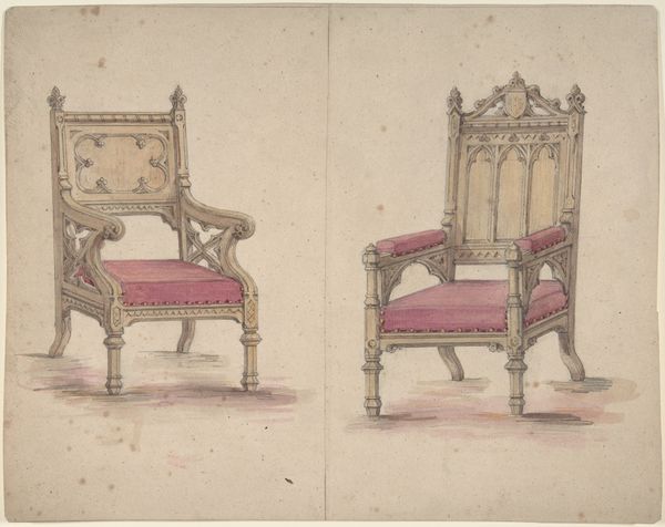Here are two gothic-style armchairs, made on paper with watercolor and graphite by an anonymous artist. The design emphasizes the material contrasts, with a rigid-looking framework against the plush seat and armrests. This interplay of hard and soft is not merely aesthetic; it speaks to the social function of furniture, combining the support with comfort. The Gothic style itself—with pointed arches and a cruciform pattern—references a specific cultural heritage, associating the chairs with tradition, authority, and perhaps even a sense of spiritual grandeur. We should also consider how the making of this design relates to the larger world of production. Was this drawing intended as a guide for a cabinetmaker? Or was it a speculative exercise, an exploration of form and style? Either way, the drawing represents the crucial first step in the creation of a material object, one that would have involved considerable skill and labor to bring into being. Ultimately, what is represented is a design for chairs, and chairs are for people. In this respect, materials, making, and context offer us a better understanding of an artwork, and challenge the distinctions between art and craft.