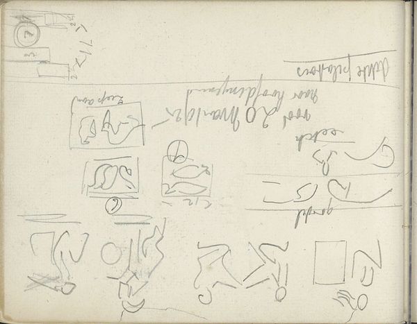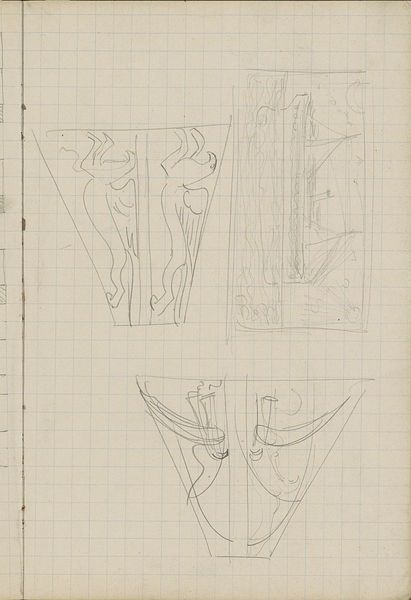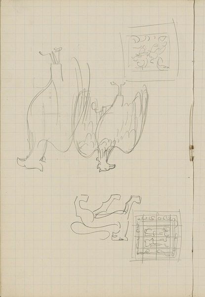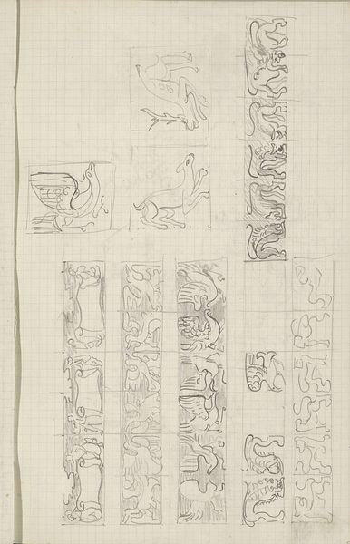 Editor: This is "Ornamenten met vogels, een bok en een strijder," or "Ornaments with birds, a goat, and a fighter," a pencil drawing on paper from around 1925 by Carel Adolph Lion Cachet. It reminds me of an initial sketch, a fleeting thought. What's your take on it? Curator: I see a fascinating intersection of tradition and modernity. Cachet, working in the early 20th century, seems to be grappling with his artistic heritage while embracing new visual languages. The figures, the goat and fighter specifically, feel rooted in classical mythology, perhaps hinting at power dynamics and the roles we play. Do you think that the almost careless arrangement on the page reinforces this tension between the traditional and modern? Editor: I can see that, now that you mention it. The rough geometric patterns definitely contrast with the more fluid, organic forms of the animals. It feels like a deconstruction. Curator: Precisely! And deconstruction can be a powerful tool for social commentary. By breaking down these established forms, Cachet may be questioning the very foundations of those traditions and narratives, revealing how notions of identity and power were constructed during this era. Think of the contemporary movements questioning empire and patriarchal norms that Cachet was experiencing in the Netherlands. Editor: So you're suggesting that these seemingly simple sketches are actually quite subversive? Curator: Potentially. Remember, art is never created in a vacuum. The context of Cachet's time – the rise of fascism, anxieties about cultural identity – seeps into his work, even in preliminary sketches like this. What at first appears as ornamental might actually be an engagement with contemporary issues, presented in an accessible, albeit unfinished manner. Editor: That's definitely given me a new perspective. I initially saw it as just a study, but it's clearly engaging with deeper cultural anxieties. Curator: And that is what makes this unassuming piece so compelling, and very much a piece of it’s time, fraught as it was. Thanks for your insight.
