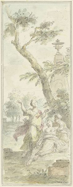 Dionys van Nijmegen created this design for a wall panel using pen and brush, with grey and blue ink and watercolour. The artwork's appearance is delicate, an inherent quality of watercolour. Nijmegen's pen and brush strokes give texture, weight, and form to the figures. It was made using techniques associated with preparatory drawings, which require precision and control to map out details and plan the composition of the final artwork. The skill involved in watercoloring belongs to histories of creative practices and aesthetics, alongside that of craft and fine arts. The wall panel design reflects the labor and politics of the Dutch Golden Age, a time of prosperity and artistic flourishing. The amount of work and skill involved in the production process highlights the value placed on craftsmanship and artistic expression. Understanding the materials, making, and context emphasizes the full meaning of an artwork, challenging distinctions between fine art and craft.