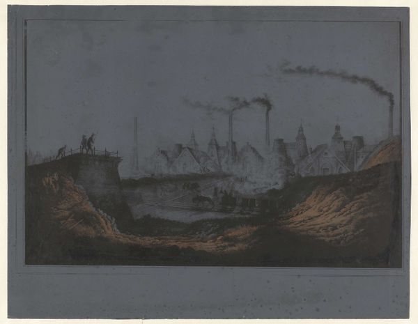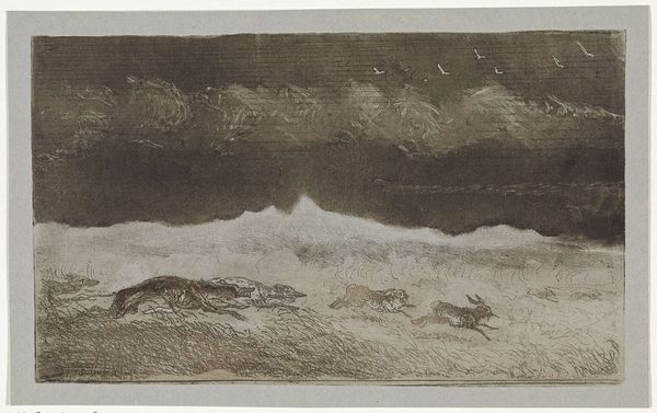 Curator: Washington Allston's "Ship in a Squall" captures a vessel braving tumultuous seas, a potent symbol of struggle. Editor: The composition immediately strikes me; the limited palette and stark lines convey a dramatic, almost apocalyptic mood. Curator: Absolutely. Allston, an American painter, was deeply influenced by the Romantic movement. His works often reflect themes of human vulnerability against the backdrop of nature's power. Consider, too, the role of maritime trade in the early 19th century and the risks associated with seafaring. Editor: Note how the white of the ship and waves contrasts with the reddish-brown ground; it is a calculated choice which adds to the overall sense of peril. The diagonal lines suggesting rain further destabilize the scene. Curator: Indeed, and perhaps there is a broader statement here about societal instability, economic uncertainty, and the precarious nature of human existence. Editor: Well, regardless, Allston's orchestration of line and tone delivers an unforgettable image. Curator: One that continues to resonate with our anxieties and hopes today.