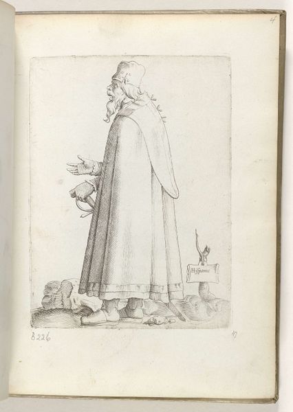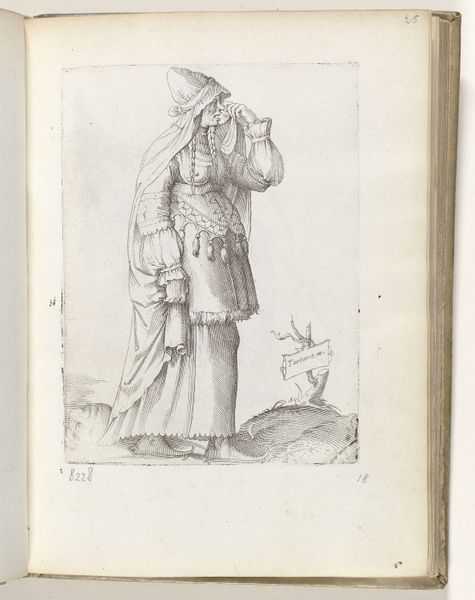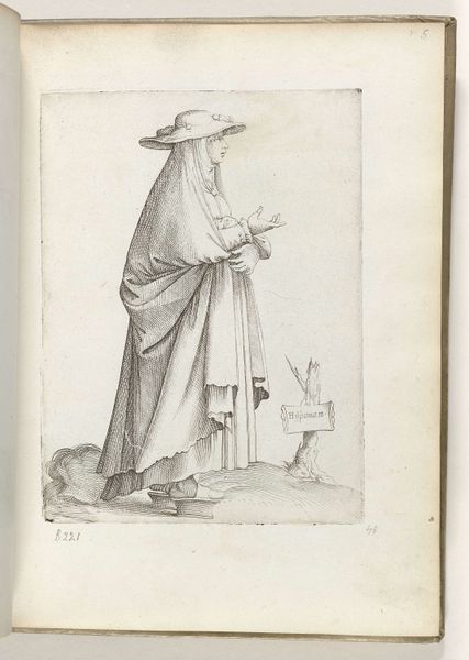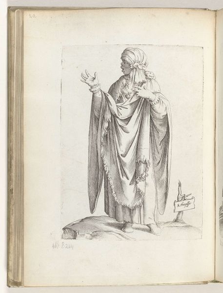 Curator: Here we have Enea Vico's "Epirota m(ulier)," a print dating from before 1558, now residing in the Rijksmuseum. It's a detailed engraving of a woman, rendered in the Mannerist style. Editor: Immediately, the stark lines and somewhat severe expression convey a feeling of austerity, a stern gaze fixed on some distant point. Curator: Indeed. Vico situates this woman, identified as an Epirote, within a visual language of power and status, but also of specific cultural representation. Who was she, what was her social position within Epirote society? The text itself might function as a kind of early ethnographic marker. Editor: From a formal point, observe the drapery; the lines almost seem to dissect rather than caress the fabric. What does the density of line-work communicate about the cape versus her simple dress? Curator: This could tell us something about Vico’s interest in rendering textures as a form of communicating hierarchical codes of class or occupation. The meticulous rendering speaks volumes. And it’s not only her attire that speaks, but the symbolic weight assigned to her stance in relation to a generalized, if classical landscape—in this case, signified by the stone. Editor: What do you make of the object held near her breast? Curator: Ah, yes! A reminder perhaps of her potential role as the woman holding both the home and knowledge together during shifting alliances, but this demands we ask not only who does she become on paper in service of? We must address whose interests it served and how this figure engages themes related to broader intersectional narratives about the era. Editor: It’s fascinating how much detail Vico manages to convey. This piece is an exceptional example of how the limitations of monochrome engraving can, paradoxically, enrich the viewing experience, almost compelling you to decode, pixel by pixel. Curator: Absolutely, it challenges us to delve beneath the surface, seeking not just to understand a visual representation but to explore the multifaceted layers of history, identity, and power dynamics at play. Editor: It is certainly an engraving that invites much deliberation, not just on its execution but its subject's story.
