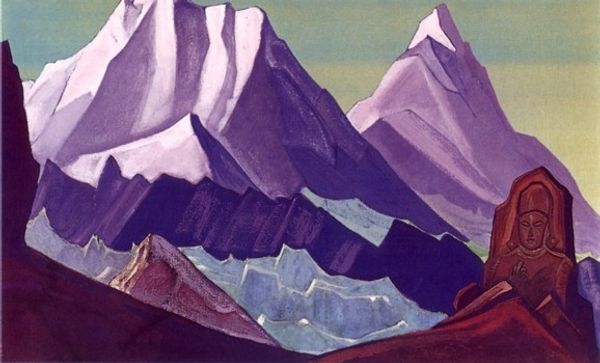 Curator: "Red Horses," executed in tempera and oil-paint around 1925, beckons us into the vibrant vision of Nicholas Roerich. The piece resides currently at the Nizhny Novgorod State Museum of Fine Arts in Russia. Editor: The intensity of the colors is what strikes me immediately. That deep cerulean sky and the sharp angles of the mountains really draw the eye upwards, then the warmth of the horses…it’s quite striking. Curator: Roerich, deeply invested in Asian art and thought, particularly Tibetan Buddhism, often infused his landscapes with symbolism tied to peace, spiritual quests, and the power of nature. I believe "Red Horses" serves as a potent visual metaphor. Horses are recurring figures for Roerich who often used it as a symbol for the agency and freedom to choose one's own direction. Editor: The way Roerich uses geometric forms is captivating, don't you think? Those rigid, almost crystalline facets in the mountains. How the texture contrast makes each part more pronounced. Curator: Absolutely. That deliberate stylization elevates it beyond a mere landscape, venturing into Expressionism. He’s actively reshaping the visible world to project an inner emotional landscape. It also gives Roerich's art a foot in Asian art style that often uses landscapes to express interior feelings and philosophical positions. Editor: And there's that interesting contrast between the grandeur of the mountains and the small figures of the red horses. The way their implied movement gives that static setting a palpable sense of latent power and activity. This makes them almost central despite the dominance of the orography. Curator: I agree. And given the historical period, just after the Russian Revolution, it might suggest revolutionary upheaval. Are these "Red Horses" a commentary on a country galloping towards an uncertain future? We must ask what do you see the symbolisms? To me it looks like he saw it coming with certainty and the inevitability that follows the establishment. The work might invite reflections about revolution, society, the old regimes versus the new society that's brewing at that moment in Russia. Editor: Whether political commentary or simply a brilliant manipulation of color and form, Roerich’s piece presents a powerful study of how shapes influence emotion, as well as meaning that lies deeper within. Curator: Roerich truly invites a deep exploration of history, society and subjective spirituality through vivid artistic means.