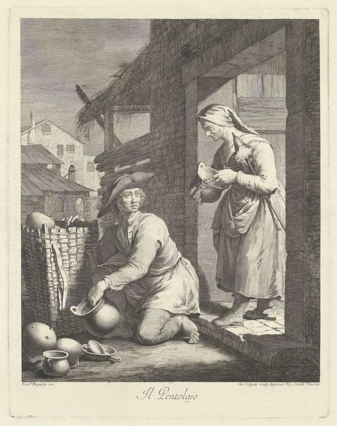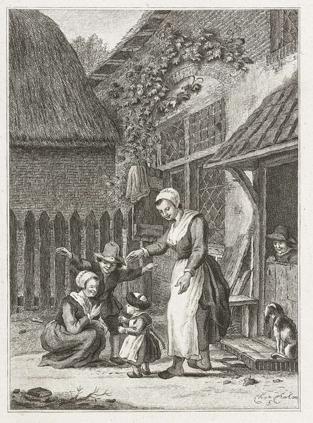 Editor: This is "Two Girls Playing with a Doll" by Pieter de Mare, made around 1777-1779. It's an engraving. I'm struck by how detailed the etching is; you can really feel the textures of the brick and the girls' clothes. What symbolic meaning do you think might be present in this seemingly simple scene? Curator: It's a wonderful example of genre painting. The doll, of course, acts as a powerful symbol. Think of the "puppet master" archetype. This simple toy alludes to larger questions around control, imitation, and the roles girls are expected to play. The girl with the doll presents it to the younger child – this offering echoes older ritualized gift giving ceremonies. It's interesting to see how the older sister figure passes along this symbol to her sibling; she passes on cultural expectations for femininity. What else do you notice? Editor: The open door… It seems like a gateway. Does it mean something more, or is it just background? Curator: The open door offers an aperture that might bring a feeling of hope to this domestic scene. Perhaps it symbolises choice, potential futures. Remember, during this era, childhood was increasingly seen as a separate stage of life, a period of innocence but also a time for shaping future citizens. Do you agree? Editor: That’s interesting. I was just seeing two kids playing. It's wild to think all that could be layered into such an everyday scene. Curator: Images often carry much more than meets the eye. What appears simple can often be complex and resonant with cultural and psychological meaning. Editor: Thanks. Now, when I look at it, I see how charged everyday images can become with the weight of societal expectations, even in something as simple as girls playing. Curator: Exactly. We learn to “read” these symbolic messages throughout our lives. It makes one wonder about the unacknowledged symbolic weight of toys today.