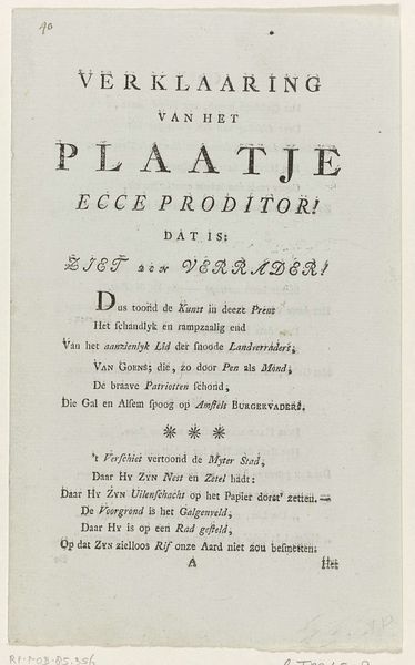 Editor: We’re looking at "Explanation of the Allegory on the Deposition of the Eight Overlieden of the Surgeons' Guild in Amsterdam, 1732," an engraving from 1732. It’s all text, dense and a little intimidating. What can we unpack from this piece beyond just a historical record? Curator: Indeed, this isn't just informative; it's a powerful political statement disguised as descriptive text. How do you see it functioning as a form of social commentary in 18th-century Amsterdam, especially regarding the role and representation of surgeons? Editor: Well, the title suggests a power struggle within the Surgeons’ Guild. Was this a common occurrence, and what was the role of "overlieden?" Curator: Precisely. These overlieden were powerful figures within the Guild. This print highlights a moment of upheaval, likely reflecting tensions about power, accountability, and perhaps even access to the guild. Consider this engraving as a form of early "op-ed" – how might it sway public opinion or solidify a particular narrative? What tools does it deploy in these early forms of media? Editor: It seems accusatory, especially with phrases like "der snoode en eerelooze spreeken"—of foul and disgraceful speech. Was this kind of direct criticism typical for the time? Curator: Not necessarily. While criticism existed, the printing press allowed for a wider distribution of opinions, albeit still largely among the elite. This piece is not merely about surgical procedures; it’s about ethics, governance, and reputation within a specific professional group and more generally the civic sphere. Think of how identity, power and even morality is shaped by such cultural expressions. What assumptions can we make about the engraver's intentions and their target audience? Editor: This makes me see the print as more than just a record; it’s a piece of propaganda, even. I’m intrigued by how relevant these power dynamics still are today. Curator: Exactly. By recognizing this print’s inherent biases and political undertones, we’ve expanded our understanding beyond the surface to uncover layers of social dynamics, which invites contemporary intersectional thinking about identity, class and power structures.