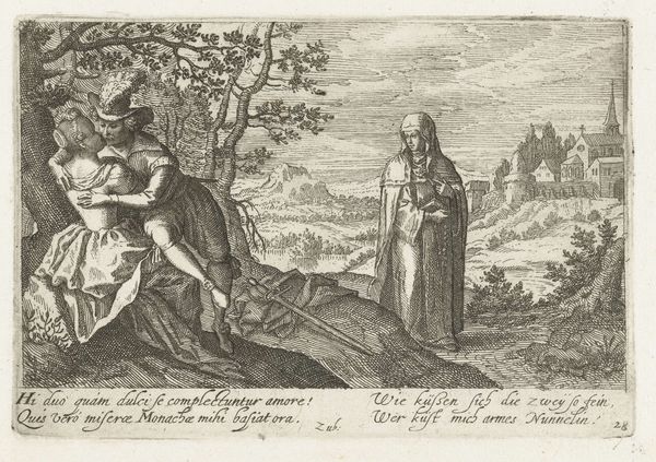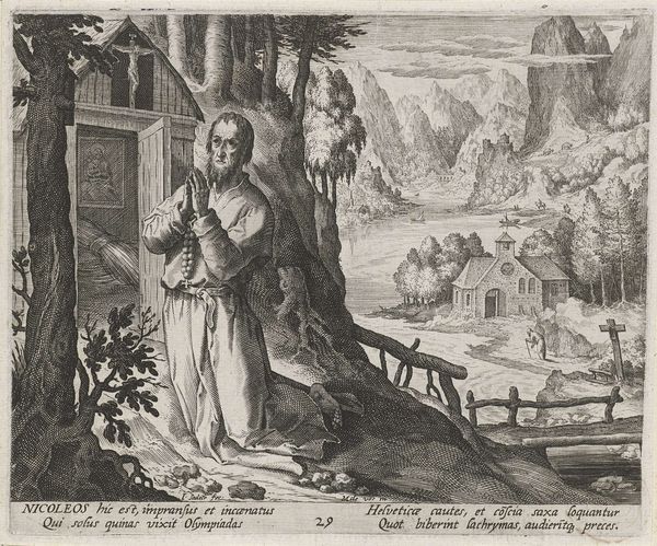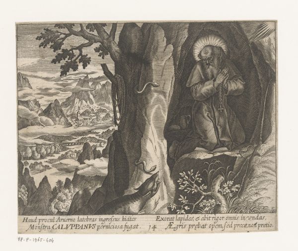 Curator: Johann Sadeler I created "Caluppanus de kluizenaar" in 1594, an engraving now housed here at the Rijksmuseum. It's quite a piece, weaving together landscape, medieval themes, and elements of history-painting all in one image. Editor: My first impression? Bleak. It's starkly beautiful but there is such a weightiness to it. The man huddled in the cave seems to be warding something off or protecting himself. And are those serpents I see around the frame? Gives me the shivers. Curator: It is interesting that you focus on bleakness. From an intersectional lens, consider the historical context of monasticism and isolation—these acts weren't simply about individual piety but often represented a form of resistance to societal norms, especially during times of religious and political turmoil. The snakes could represent the "monsters" defeated by the Monk CALUPPANVS. The text below the artwork indicates the landscape around the Monk gains solace due to him driving away terrible monsters in that location. Editor: Right! That flips things on its head, doesn't it? So, instead of just a hermit cowering in a cave, we see this figure as actively confronting malevolence. The cave itself, previously oppressive, becomes a symbol of refuge and agency. The serpents may represent all those evils or personal struggles. Maybe I should feel less creeped out and more empowered by the image...or at least sympathetic to Caluppanus' plight. Curator: Indeed, thinking of the socio-political factors that might inform a reading of the piece is also central. The role of the monastery in offering safety in times of danger, intellectual thought, and in its way defying norms is also vital here. Editor: The detail in the landscape is fascinating too, despite the limited medium. There is this vast expanse visible through the cave opening; an almost idyllic vista with sharp, jagged mountains on the horizon. This gives a powerful contrast with the confines of the cave, underscoring the monk's conscious choice to detach himself from earthly pleasures. Perhaps its a mental state depicted metaphorically as place. He needs isolation to combat dark entities, yet, far from bleak, there is an entire vista within reach. The monk seems the antithesis of the trope about 'people hiding under rocks'. The rock *itself* has become a platform. Curator: Ultimately, I think it's the enduring resonance of that dichotomy—the solitary figure facing formidable forces—that makes this engraving so compelling even now. It offers a glimpse into personal choices and spiritual dedication, and how this is all connected to larger societal systems. Editor: For me, it's the image's transformative quality; it's one thing to encounter it at face value, but completely changes again the more we investigate and question it.