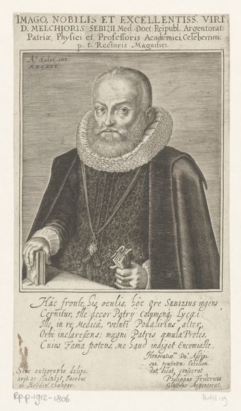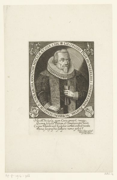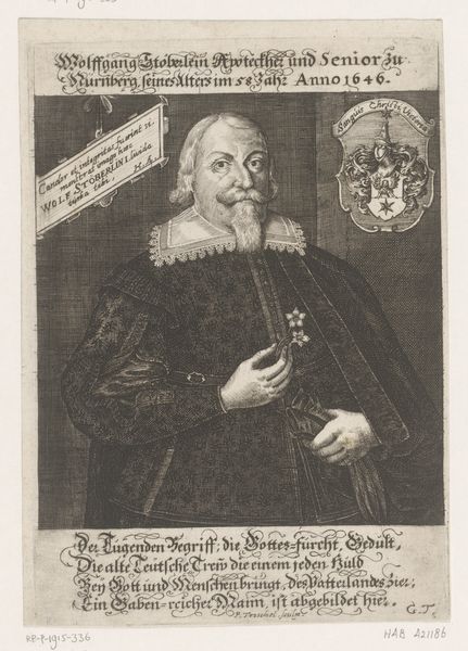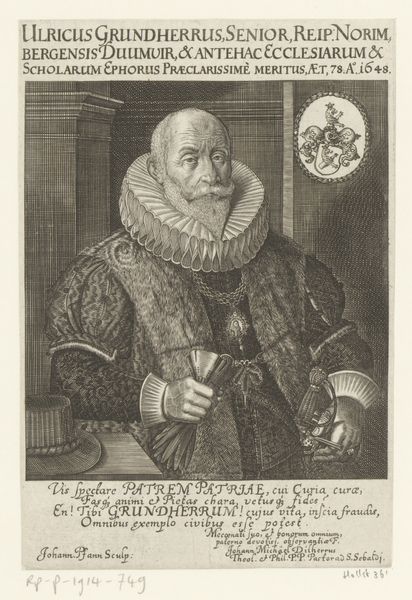 Curator: This is a portrait engraving of Andreas Imhof, dating sometime between 1648 and 1663. The artist who created this print is Johann Pfann. Editor: My first impression is one of established power. Look at the sitter, so self-assured with that imposing ruff. Curator: Indeed. The ruff itself became quite a status symbol in that era, particularly amongst merchants in places like the Dutch Republic and Nuremberg, as here, where Imhof served on the council. We must note also the symbols around him—the suggestion of heavy brocade or fur, the elaborate family crest, even the book below the image offering fulsome praise in Latin, all emphasizing his wealth, power, and respected standing in the community. Editor: Absolutely, it's layered with imagery of civic virtue. I wonder about that heavy fur mantle… could it be marten? If so, it reinforces a clear visual message. We see symbols of not only status but a connection to historical symbolism and values. The weight and opulence speak to something beyond mere display, gesturing to a lineage, a belonging. Curator: Beyond lineage, it hints at access. In his roles in Nuremberg, Imhof would have controlled a considerable amount of material resources, so his access is visualized. This speaks not just of status, but very clearly, power within the city itself. The print also exists as propaganda. To own an engraving of a respected local politician could act as social currency in this period. Editor: That makes complete sense. And looking closely at the face, there's an individualized softness too, in spite of the stern expression. Almost a knowing glint. It humanizes him somewhat, bringing him out from beyond pure symbolism and power display. Curator: An important addition. It would certainly humanize a civic leader to his constituency if that likeness also adorned their walls. Ultimately this portrait mediates on the nature of civic identity in the mid-17th century. Editor: So beyond an artwork, this is a powerful symbol of social structures, cultural aspirations and that eternal human desire to leave a lasting mark.