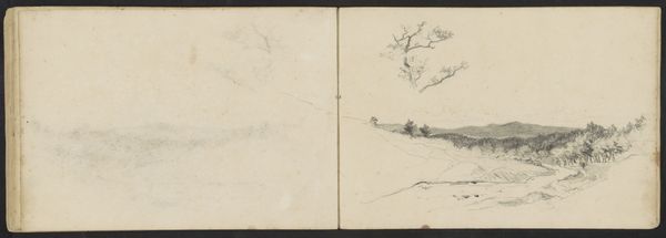 Editor: So, this is Willem Cornelis Rip's "Boerderij in een landschap," dating roughly between 1866 and 1922. It's a sketch, pencil and ink on paper, found within what seems like the artist’s sketchbook. What strikes me is its simplicity; a quick capturing of a rural scene, almost dreamlike. What do you make of it? Curator: Dreamlike, yes. These quick notations are replete with cultural information. Notice the recurring imagery of the farmhouse throughout art history—a universal symbol of shelter, family, and connection to the land. But here, it's presented with such a light touch. Does that tell us anything about Rip's own relationship with those ideas? Editor: Possibly. The sketchiness lends it a fleeting quality, like a memory. Perhaps he’s not grounding us in a literal representation, but exploring an idea of "home." The emptiness of the left-hand page could be purposeful...a visual void against which we perceive meaning. Curator: Precisely! That negative space becomes as important as the farmhouse itself. And what of the very visible marks of the artist’s hand, the unblended pencil strokes? Are we meant to see the *process* of creation, the journey of observing and recording? Think of other landscapes you’ve seen, and what those artists chose to reveal about their methods. Editor: That makes me wonder if this was practice, rather than a finished piece, allowing for freedom of expression...not worrying about conventional depictions of rural life, unlike, say, Millet. Curator: Excellent point. Look how these small drawings in artists' sketchbooks hold such enormous power in reflecting personal thoughts, intentions, or even anxieties that resonate over time. Each line whispers a story. Editor: This definitely shifts my understanding. Seeing the 'sketch' aspect differently changes my approach from appreciating finished artistic expression, to understanding intimate personal motivations behind simple lines and composition of what home may signify to any human being. Curator: Indeed. And through understanding that shift, perhaps you've just grasped the power of a seemingly simple image!