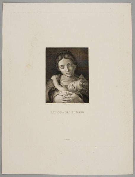Curator: Before us, we have Antonio Perfetti's "Madonna and Child," held at the Harvard Art Museums. Perfetti was born in 1792 and died in 1872. Editor: It feels surprisingly intimate for a religious subject—the stark blacks and whites lend a dramatic and somewhat somber air. Curator: The image clearly draws from a very specific visual culture, and fulfills certain demands made by the Church. It's a visual argument for the divine sanctity of both mother and child. Editor: Yes, but I find it more striking how Perfetti uses light to sculpt form. The folds in the drapery, for instance, create their own abstract rhythms and tensions, independent of the figures. Curator: It’s important to remember that devotional images like these were often commissioned and served didactic purposes. The Madonna became a crucial figure of cultural power. Editor: Regardless of its cultural function, the interplay of light and shadow produces a captivating aesthetic experience. Curator: A useful aesthetic experience for the culture that consumes it. Editor: I suppose we both get what we came for.