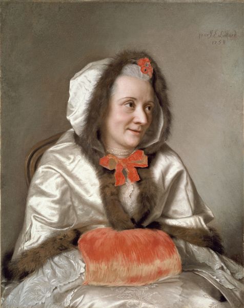 Curator: Looking at this canvas, one gets an immediate sense of… restraint, almost melancholy, wouldn't you say? Editor: Yes, there’s a certain stillness. I find it fascinating. We’re looking at "Portrait of a Lady," an oil painting created sometime between 1725 and 1750. It's currently housed here at The Art Institute of Chicago. What can you tell me about the woman in this portrait? Curator: Given the social and political hierarchies of the time, her clothing subtly speaks to her station. The details of her cap, her fur trim, and that substantial bow suggests she is certainly part of a privileged class. The blue and pink drapery adds a sense of visual richness. However, these very markers could have, ironically, restricted her freedoms and voice within that society. Editor: Absolutely. Portraits like this served a specific function in constructing social identity. We need to consider the institutions that perpetuated such imagery and what purposes it served. This Baroque painting might seem like just another portrait, but it reinforces ideas of status, gender roles, and the public performance of identity within that era. Curator: It’s intriguing how she clasps her hands, a seemingly demure pose, but is it genuine meekness or a performance expected of her? This image provides a snapshot of womanhood, yet the woman’s individual experience likely was very complex, perhaps resistant to easy classification. Also, you can see she’s meeting our gaze; a knowing look and hint of defiance? Editor: I'd argue that examining who was excluded from these artistic narratives is vital, too. Whose stories weren't being told through official portraits? The painting reflects a system of power, so interpreting it becomes a form of social critique. Curator: So true! To look at this painting is to confront a whole world of expectations and assumptions. It encourages us to dissect the visible signs of identity but also, what remains invisible in the context of the Baroque era. Editor: It shows us how much more work we must do in understanding both the beauty and limitations of the images shaping our understanding of history.