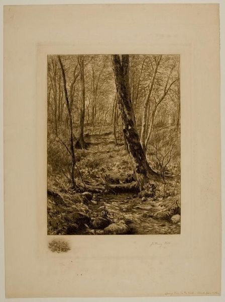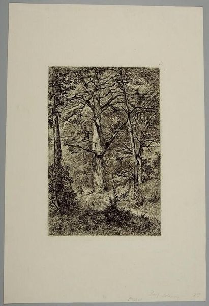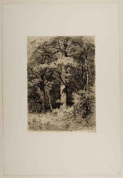 Editor: This print, titled "Forest" by Alfred Alexandre Delauney, depicts a dense woodland scene. The intricate detail almost makes it feel like you could step right into the woods. What do you see in this piece? Curator: I see a reflection of 19th-century anxieties about industrialization and its impact on nature. Consider the density and almost claustrophobic feeling. Delauney, through his masterful technique, evokes a sense of nature as a space both beautiful and overwhelming, perhaps even under threat. How might that resonate with contemporary environmental concerns? Editor: That's fascinating! So the forest isn’t just a pretty picture, but a statement about the relationship between humanity and nature. Curator: Precisely! Art often holds up a mirror to society. Reflecting on that relationship helps us understand our own place within it. Editor: I never would have thought of that! Thanks for sharing your insights.