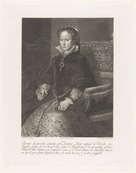 Curator: This print, residing here at the Art Institute of Chicago, is a portrait of Helena Leonora de Sieveri, or Helena Tromper Du Bois. Cornelis Visscher created it around the 1640s. Editor: The woman’s calm gaze really pulls you in. And look at those lace details! They almost feel like they are radiating a delicate, almost ephemeral, authority. Curator: Visscher was a master engraver, particularly skilled at capturing the textures and fabrics favored by the Dutch elite. Portraits like these solidified social standing. The burgeoning merchant class, with their new wealth, fueled the demand for such depictions. Editor: Right. That pristine white lace, set against the darker, heavier fabric of her gown creates this intense contrast between virtue and worldliness that was expected from the women of the time. It is all very deliberate. Curator: Absolutely. Dutch Golden Age portraiture often presented the sitters with a carefully constructed balance of piety and prosperity. What's interesting here is to think about the broader political context and rise of mercantile power. Women played an interesting role in shaping household economy and moral virtue during that time. Editor: Yes, that contrast speaks volumes, it seems almost symbolic of this tightrope they had to walk between luxury and piety. The gaze also is so central. This woman does not seem cowed, exactly. She understands how she's seen and participates in the production of her image, without fully giving herself over to it. Curator: Her somewhat reserved expression, along with the very conscious depiction of status through clothing and material details, shows the power dynamics at play and perhaps her active participation in managing them. This isn’t merely a representation; it is a constructed statement within specific social currents. Editor: Indeed. I leave this portrait now with a sense of wanting to understand the untold stories that radiate from this person depicted, of both resilience and societal pressure. Curator: And with an appreciation for the Dutch Golden Age artists’ keen understanding of how imagery can perpetuate social and political norms through a visual language.