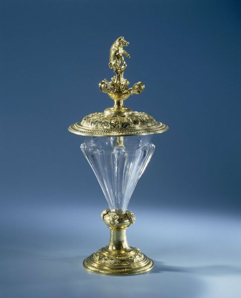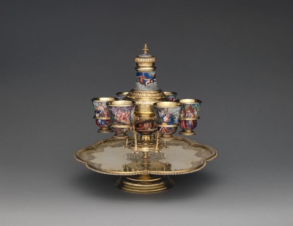This Epergne at the Minneapolis Institute of Art is made of cut glass and silver. The interplay between the clear, refractive glass and the solid, reflective silver creates a dynamic visual experience, evoking both transparency and opulence. The structure is organized around a central, elevated bowl, with four smaller bowls extending outwards. The arms supporting these bowls are balanced, creating a radial symmetry that is both elegant and functional. The intricate cut glass work forms a pattern of repeating geometric shapes, which catch and refract light to create an intricate play of light and shadow. The form invites us to consider its relationship to the historical context of decorative arts, and how it mediates ideas of luxury, consumption, and display. The epergne operates within a semiotic system where its visual elements—the gleam of silver, the sparkle of glass, the symmetry of its structure—serve as signs of wealth and status. Its design invites ongoing interpretation, reflecting evolving cultural values.
