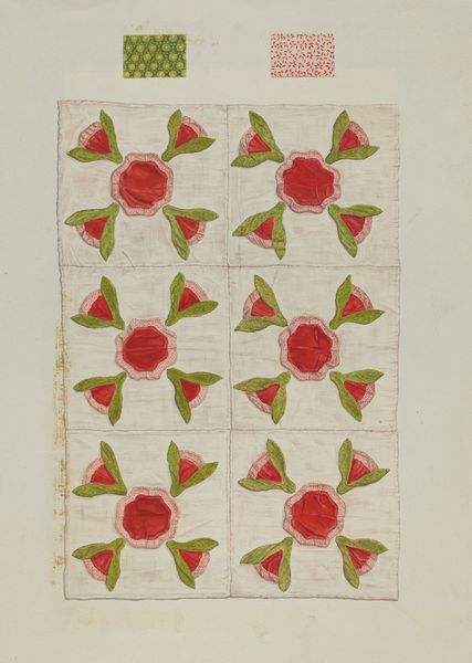 This bedspread was made by Mary Berner, using what looks like watercolor on paper. You know, it's funny how a simple palette of reds, greens, and yellows can feel so emotionally complex. I’m really drawn to the repeating motifs and geometric structure in the piece. The artist’s hand is so evident. The four leaf clover shapes are rendered in flat colors with little variation. But I can imagine Mary carefully applying each layer to create the final form. The slight irregularities in the painting’s surface make it feel so intimate, so human. It's like the artist is right there with you, sharing a quiet moment. The pattern feels both carefully planned and totally intuitive, as if the artist were just letting her feelings flow onto the material. I think of Gee's Bend quilters when I look at this piece, or maybe even Agnes Martin. It is a reminder that art is a conversation across time, an ongoing dialogue between artists, materials, and ideas.