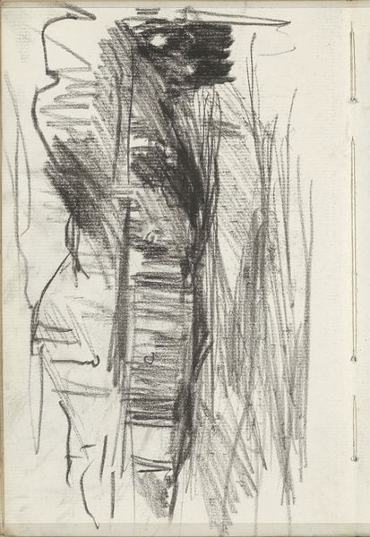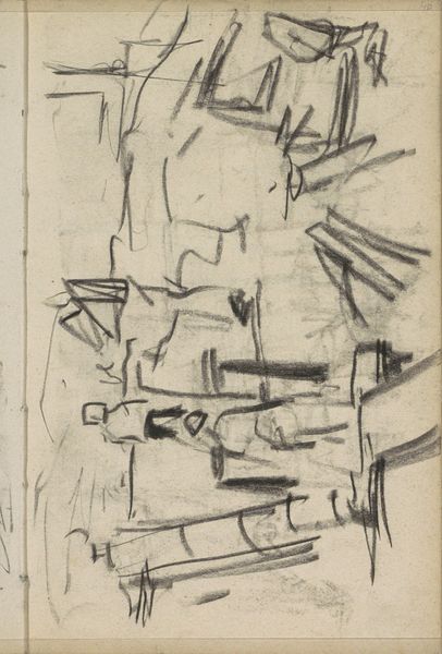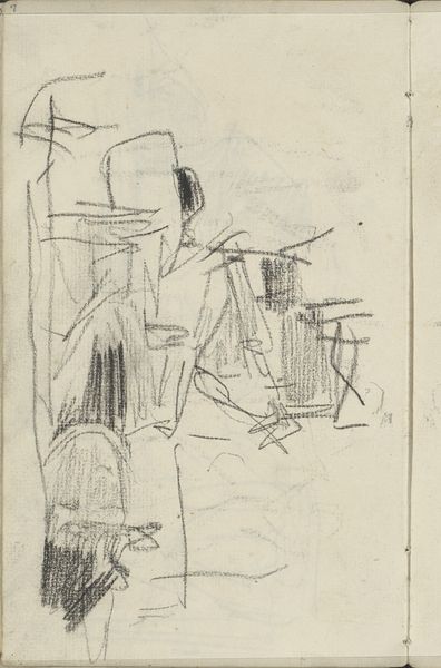 Curator: Here we have George Hendrik Breitner's "Aangemeerde Schepen," which translates to "Moored Ships." It’s estimated to have been made somewhere between 1886 and 1923, using pencil and graphite on paper. Editor: Ooh, it’s quite gestural, isn't it? A tangle of dark lines that suggests more than it shows. I feel the swaying of the masts, the creak of the wood, even before I recognize the scene. It feels… unfinished, but intentionally so? Curator: Precisely! Breitner was deeply interested in capturing the fleeting moment, the immediate impression. This drawing, now held in the Rijksmuseum, provides us with an insight into his process. He was part of the Amsterdam Impressionism movement, really committed to portraying everyday life. And this, seemingly a quick sketch, perfectly embodies that. Editor: You know, for something so sparse, it speaks volumes about the working harbor, that in-between space where industry meets the relentless energy of the water. It also gives you that wonderful feeling of eavesdropping, of witnessing a world going about its business. There is this dark foreboding mood emanating, wouldn't you agree? Curator: I think you're tapping into a powerful aspect of his work, actually. There's a tension here, an immediacy that’s palpable. These harbours in Amsterdam were a huge center for the country, it speaks about the role of work in the lives of the people, you might argue? Editor: The fact that it's just pencil adds to that rawness, I think. It's unpretentious. No need for fancy colors, just the stark contrast of graphite on paper, a sort of elegant brutality. And the paper itself, you can almost feel its texture! Curator: Absolutely. This artwork offers a unique peek behind the curtain, it speaks of a rapid technique Breitner employed to catch the fleeting nature of Amsterdam's vibrant dock life in a way other media simply could not do. Editor: It definitely feels honest, direct from the eye to the hand to the page. And perhaps, through these fleeting sketches, we grasp something more substantial, more lasting, about the spirit of that place. Curator: Beautifully put. For me, it’s also about the potential within that sketch, the hint of grander stories hidden just beneath those penciled lines.