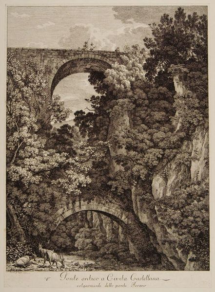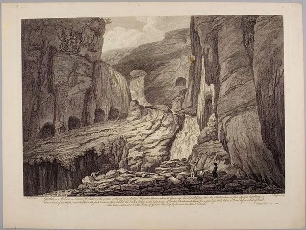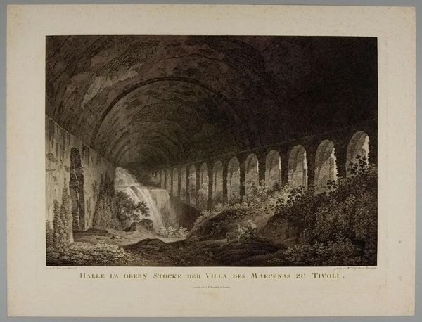 Curator: This is Johann Christian Reinhart's "In villa Mecenate a Tivoli," housed right here at the Harvard Art Museums. The dimensions of the sheet are roughly 36 by 27 centimeters. Editor: My first thought? Eerie grandeur. It feels like a stage set for some intense, internal drama. A waterfall crashes from a cavern, almost theatrical. Curator: Reinhart, born in 1761, was fascinated by the picturesque. Tivoli, near Rome, was a popular destination for artists seeking dramatic landscapes and classical ruins. These sites were powerful markers of culture. Editor: It's more than just documentation, though, isn't it? The scale feels deliberately exaggerated. We're dwarfed, both by nature and by the implied history. There's something unsettling about the tiny figures in the foreground. Curator: Absolutely. Reinhart is playing with power dynamics, isn't he? The overwhelming force of nature, the weight of the past… even the presentation of landscape participates in a broader discourse of power. Editor: It makes me think about the sublime, the way confronting something immense and terrifying can also be strangely beautiful. A bit like art itself, maybe? Curator: Well put. I think Reinhart might agree with you on that. He devoted his entire life to making art.