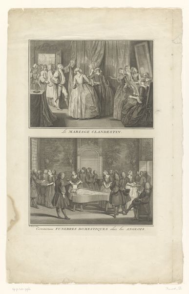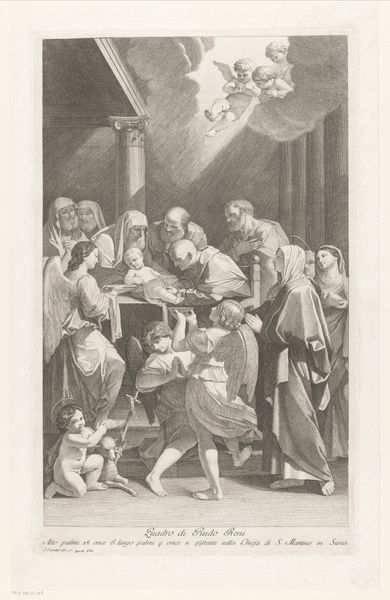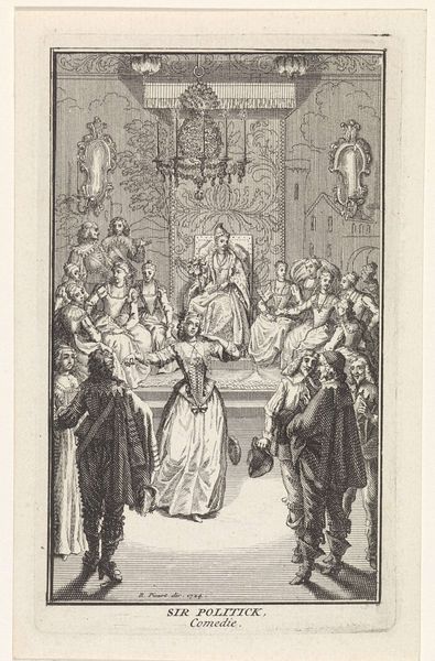Curator: The piece before us is titled "Interieur met een groep geestelijken," or "Interior with a Group of Clergymen," created by Bernard Picart between 1717 and 1728. It's an engraving, currently residing in the Rijksmuseum. Editor: The eye is immediately drawn to the complex interplay of light and shadow within the architectural space, carefully structured to define the characters in attendance. It has this dramatic, yet somewhat muted tone typical for baroque artworks. Curator: Absolutely, the artist uses the baroque style as a medium to underscore hierarchies, specifically within the historical context of religious and intellectual power structures of the time. What statements do you think the assembly communicates about privilege and access to knowledge? Editor: Semiotically speaking, the composition emphasizes clarity of form. Note how the engraving creates an incredibly detailed portrayal of textures—the fabrics, the skin, even the way the light bounces. The frame itself creates another level of commentary. It brings the viewer closer, encouraging us to interpret its components with intentionality. Curator: And how fascinating that the margins of the image themselves contain so much detail – books, scrolls, decorative motifs – almost as though the “official” narrative cannot contain the wealth of information present. Consider also the inclusion of children in the lower portion of the frame. This might be a commentary on access to knowledge for different ages, or perhaps their inclusion as witness or participant. Editor: The balance between order and complexity is certainly key here. The artist invites you to decipher each relationship with this formal structure in mind. Curator: What I find particularly potent is how Picart gives us, the viewers, the tools to dismantle the supposed objective realities by laying bare their means of production. We are thus capable of understanding those whose identities have historically been omitted and delegitimized, prompting necessary discussions about identity, gender, and access. Editor: It leaves you considering how the formal elements—light, line, texture—work in tandem to create a visual and intellectual experience. A very rewarding artistic exercise.