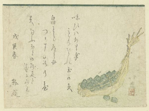 This delicate print, titled "Kuikens," presents a delightful depiction of chicks, rendered with ink on paper. The composition immediately draws you in with its playful arrangement of small, rounded forms. These shapes, defined by soft, modulated lines, suggest both a visual lightness and a tactile roundness. The chicks are distributed across the pictorial space, seemingly engaged in a lively dance. Chôsui’s use of color reinforces this sense of vitality. The pale yellow of the chicks is offset by the stark contrast of their dark features and the minimal, yet assertive, red accents of their feet. This use of a semiotic system invites us to view these chicks as more than mere representations. Consider how the structure of this composition destabilizes traditional notions of depth and perspective. The chicks appear almost flattened against the picture plane. This creates a sense of immediacy, pulling us into the world of the artwork. The print challenges fixed meanings and categories. It asks us to consider the function of visual elements within a cultural discourse. It reminds us that art's beauty lies in its capacity for ongoing interpretation and re-interpretation.
