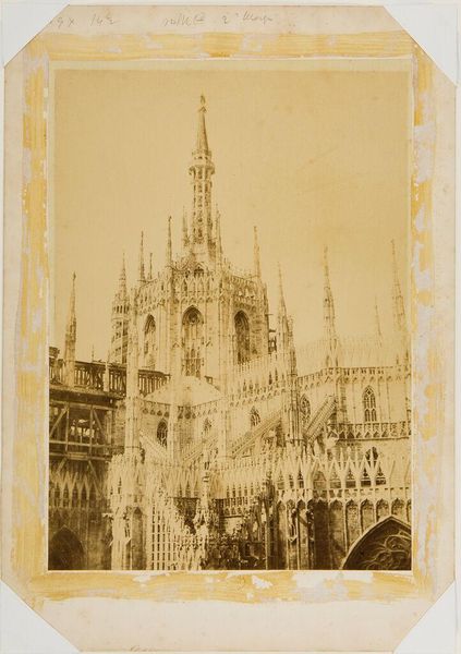 Curator: This is a photograph titled "Milano, Parte di Tergo," taken by Giacomo Brogi. It captures a detailed view of the Milan Cathedral. Editor: It feels… almost ethereal, like a city made of lace. The light is so soft, it’s hard to believe it’s stone. Curator: Brogi was quite skilled at capturing the material essence of these grand structures. Note how the repetitive elements highlight the industrial processes involved in quarrying and shaping the stone. Editor: It also brings to mind the sheer human effort—generations of artisans meticulously carving each spire. It’s a testament to faith, really, rendered in such tangible form. Curator: Absolutely. Consider the consumption of resources, the labor...these cathedrals were not just spiritual centers but economic engines. Editor: I guess, gazing at it, I feel a sense of awe. It's a reminder of the immense beauty created through collective human endeavor and belief, whatever fueled it. Curator: Indeed, and analyzing its context allows us to delve deeper into the interconnectedness of art, labor, and social structure.