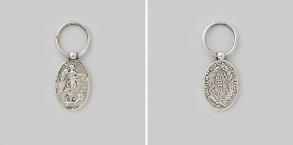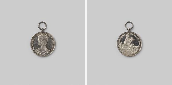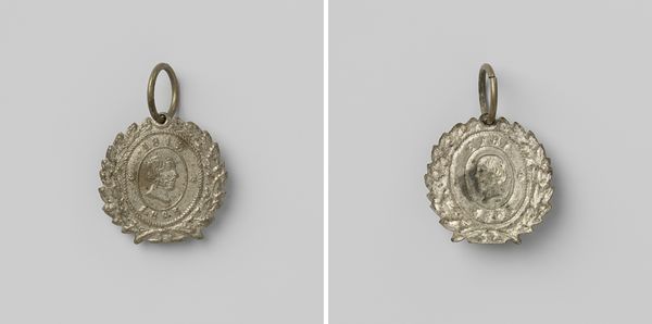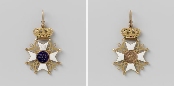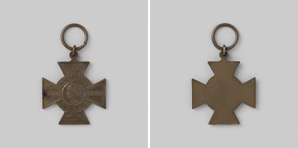 This is A. Rogmans' metal medal commemorating Wilhelmina's inauguration as Queen of the Netherlands. The medal is a study in miniature formalism. Its structure combines a symmetrical cross with a detailed central portrait. The arms of the cross are punctuated with stylized elements. These shapes create a sense of balance and order, while the textured surface of the metal adds depth. Rogmans uses the semiotics of royal power. Note the crown at the top and the portrait of Wilhelmina, framed by laurel leaves, a classical symbol of triumph. The artist employs these motifs to reinforce the medal’s function as a symbol of royal authority. This work invites us to reflect on the interplay between form and iconography. It also prompts questions about how power is represented through objects.