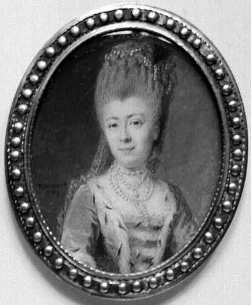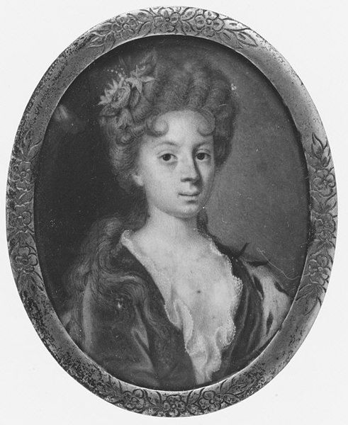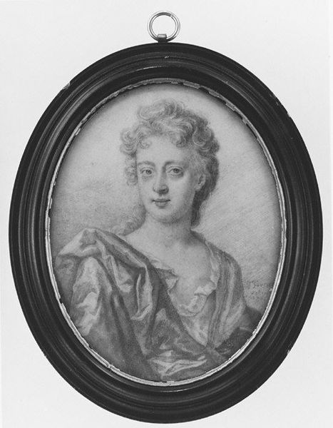 Curator: Here we have a portrait, believed to depict Princess Charlotte Amalie, daughter of Frederick IV of Denmark, crafted sometime between 1723 and 1747 by Hinrich Jacob Pohle. Note the delicate precision, characteristic of academic Baroque art. Editor: She looks like a ghost! Sort of haunting and vulnerable all at once, peering out from this grey void. Curator: Indeed, the work offers a powerful study in contrast. Pohle employed expert draughtsmanship, and if you look closely, one sees how line and form create dimensionality within the confines of the miniature. It invites contemplation about Baroque ideals of beauty and representation. Editor: That’s it exactly! It’s like the artist trapped a real-life noble lady and her royal anxieties in an oval snow globe, all powdered wig and fancy crown. Curator: An astute observation. The monochrome palette directs the viewer to focus on form, an academic concentration on achieving naturalism, while highlighting social position. Editor: Still, all those textures of ermine fur, glinting jewels...in grayscale! It feels like the essence of the princess is rendered and yet something feels...muted, distant. Curator: Certainly. In Pohle’s work, representation and aesthetic construct coalesce. Through the deployment of convention, the sitter, is simultaneously present and mediated. Editor: All that to say, Pohle did what he could with the materials available at the time to immortalize a melancholy princess! Thanks for walking me through that! Curator: You are most welcome, the insights you have shared, are invaluable.