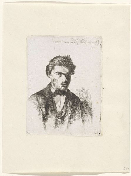 Curator: This is Frederik Hendrik Weissenbruch's self-portrait, created sometime between 1843 and 1887. It’s an etching, a remarkable example of the printmaking process. Editor: It projects a feeling of melancholy. The sitter's gaze, though direct, feels heavy. There is a palpable sense of interiority being carefully displayed for the audience. Curator: The composition is skillfully controlled. Notice the delicate hatching and cross-hatching that builds up the tonal range, defining the contours of his face and clothing with precision. Editor: Yet, his suit feels less convincing than the rest. Its execution, compared with the sharpness of the face, is looser. I find myself asking whether that suggests something about the sitter's self-perception. How did socio-economic expectations influence the presentation of self? Curator: A provocative suggestion! But perhaps it’s more about Weissenbruch experimenting with different densities of line, allowing the suit to recede slightly, focusing the eye on the face, which is indeed the strongest element. The print medium allowed for a real exploration of light and dark and a range of texture not dissimilar from oil painting. Editor: That's certainly plausible from a technical perspective. Though thinking about the period, I wonder about the societal pressures. The suit, and the bow tie, can they also be seen as social armour in this medium? A method for ensuring his belonging within artistic circles, rather than allowing personal anxieties to shape his persona through an artistic self-portrayal? Curator: Well, either way, I'm taken with the work’s inherent formal tensions, how it achieves such expressive depth within such a restricted palette. Editor: I’m more fascinated by how these visual constraints both invite, and potentially obfuscate, social commentary about artistic representation in the 19th century.