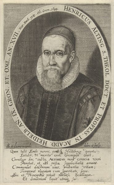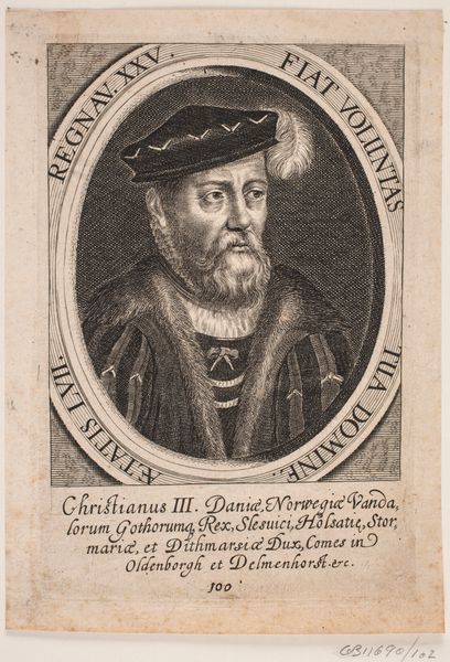 Curator: Looking at this somber face, what is your immediate impression? Editor: Heavy. Weighted, literally and figuratively. All that fur…he’s drowning in symbols of power and, dare I say, his own mortality. Curator: I agree. Let's unpack some of those symbols. We are looking at a print, specifically an engraving from 1646, titled "Christian III." It now resides in the Statens Museum for Kunst. Editor: Right, Christian III who lived about 100 years before the print was made! And his image is framed by Latin phrases that reinforce ideas of power invested from God – “Thy will be done.” Are these standard tropes, typical ways to construct an image of monarchy? Curator: They certainly served as visual declarations, almost a shorthand for divine authority. This type of portrait, with the inscriptions and regal garb, tapped into a pre-existing iconography that the intended audience would have immediately understood. It’s all quite carefully calibrated. Even the way the face is modeled. Editor: It’s fascinating how the engraver creates tone using only lines, hatching and cross-hatching, to capture the gravitas of a king who implemented the Protestant Reformation in Denmark-Norway. It feels like an exercise in controlled visual language. No wonder these prints circulated so widely. It became part of political identity! Curator: Yes, this image would have served as a powerful tool. The choice of imagery and inscription presents a leader aligned with divine purpose, intended to evoke reverence and stability in the viewer. What the symbols transmit here continues to have a profound weight in how the subject is being publicly represented. Editor: This piece exemplifies how even seemingly straightforward portraiture is deeply intertwined with socio-political messaging. Curator: It leaves me reflecting on how powerful symbols speak through art over time. Editor: And for me, on the visual strategies art deployed for creating and circulating political power.