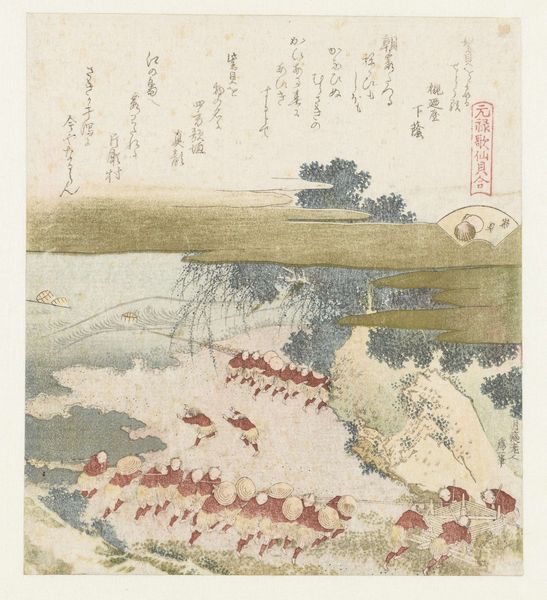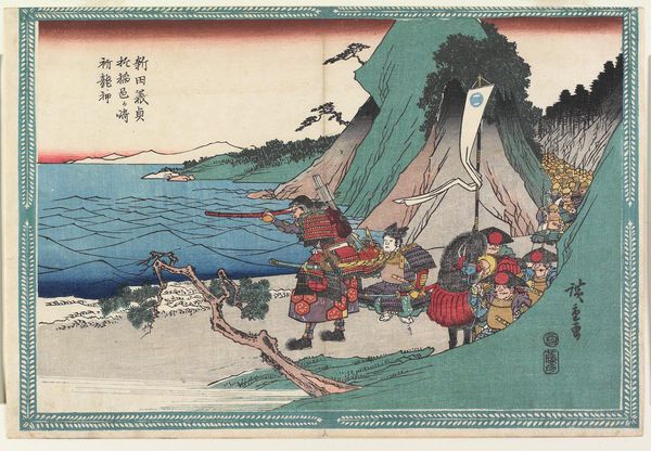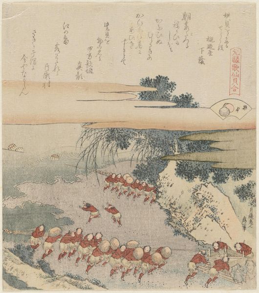 This woodblock print, “Kustgezicht met vissers die netten binnen halen,” was made in the first half of the 19th century by Totoya Hokkei. Born into a period of social hierarchy, Hokkei’s work subtly reveals the lives of common people. The image captures a communal act: fishermen hauling nets, their bodies unified in labor. Hokkei does not represent these figures as anonymous; they are individualized through posture, clothing, and activity. The fishermen are framed by the serene backdrop of the sea and Mount Fuji. Fuji, often a symbol of power and permanence, contrasts with the daily grind of the fishermen. Hokkei invites us to consider the intersection of nature, labor, and collective identity. The print encourages us to reflect on our connections to each other, our environment, and the labor that sustains us. It reminds us that within grand landscapes, there are the personal stories of struggle, resilience, and community.