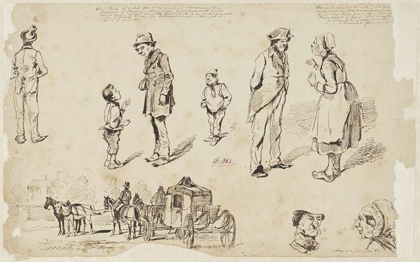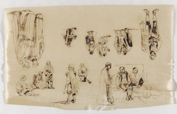 Editor: We’re looking at "Forskellige figurstudier (danske)", or "Various Figure Studies (Danish)," created between 1844 and 1846 by Martinus Rørbye. It's a pencil drawing housed at the SMK, the National Gallery of Denmark. It’s mostly sketches of people, alone and in small groups. It strikes me as almost voyeuristic, like a glimpse into candid moments. What do you see in this piece? Curator: Voyeuristic, yes, that's a good word. Rørbye’s drawings always have this feeling, like peeking through a keyhole into 19th-century Copenhagen. Look at the light pencil strokes—they are so light and free, capturing the essence of these figures with an economy of line. It feels like he’s trying to capture the feeling, more than precise details. I wonder what the artist might have been thinking. Editor: He probably had a sketchbook and jotted people as they passed. Curator: Perhaps. Rørbye was a keen observer of daily life, heavily influenced by Romanticism. You get this wonderful sense of fleeting moments. It is this combination of precision and ethereality... I’d be curious to know, what mood do you sense in this? Editor: Mmm… Intimacy? Casual moments captured so well they feel extremely personal. And although it seems unfinished, this sketch really does bring to life an early-nineteenth-century city and all its people. Curator: Intimacy, yes, you've struck something true there! Rørbye's real skill wasn’t only what he drew, but in inviting us to become temporary residents in that time and place. The roughness, combined with that amazing perspective of his, provides some magic. Editor: This was incredibly insightful. It made me appreciate how a simple sketch can speak volumes. Curator: Likewise! I enjoyed the moment, together. Now I see it with new eyes as well.