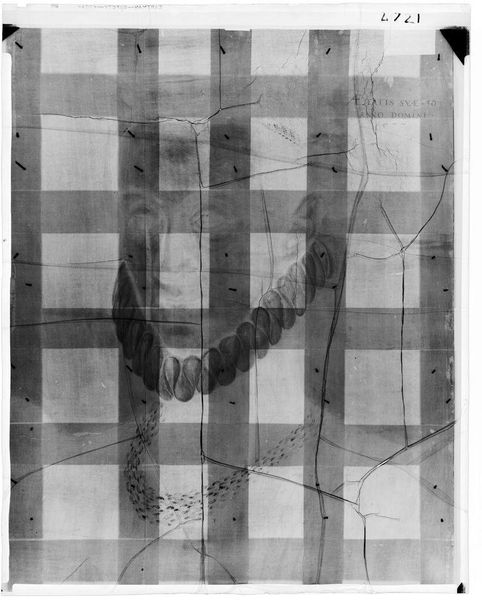 Curator: This is an X-radiograph of "Portrait of a Woman," originally by El Greco. The image allows us to see beneath the surface of the artwork. Editor: It’s haunting. The stark contrast between the ghostly visage and the clinical grid creates an eerie tension. Curator: Indeed, the X-ray reveals the artist’s process, the underpainting, and corrections. It allows us to consider the social conventions of portraiture in El Greco's time, particularly for women. Editor: The semiotic weight of the gaze, even in this abstracted form, remains powerful. Consider the underlying structure—the arrangement of light and shadow. Curator: It also prompts questions about authenticity, labor, and the layers of meaning embedded within a single image. We are peeling back time, history, and identity. Editor: Looking at it this way, it is more than a portrait; it is a study in artistic creation.