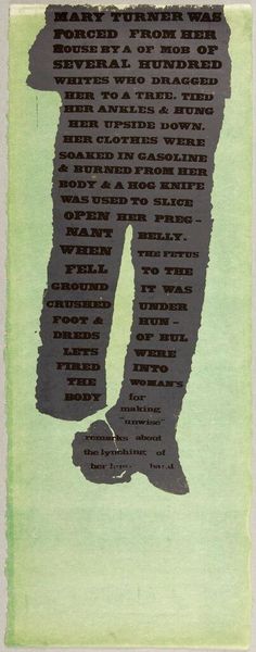 Curator: This stark print by Maureen Cummins titled "Rufus Moncrief" immediately strikes me with its brutal directness. The figure described entirely in text is almost ghostly against the pale green background. Editor: The impact is undeniably visceral. The choice to render such violence through language, rather than depiction, amplifies the horror, doesn't it? The figure is literally being erased by the words. Curator: Precisely. The text becomes the body, a body violated and destroyed. It speaks to the long history of racial violence and injustice, particularly lynching, in America. Consider how Cummins uses the printed word, a medium often associated with truth and knowledge, to document and expose a horrific reality. Editor: And the simple act of not removing one's hat becoming a death sentence. The hat becomes a potent symbol of defiance, of refusing to submit to a social order built on terror. It's a symbol that speaks volumes about the power dynamics at play. Curator: It's a powerful reminder of the stories that need to be told, the histories that must be confronted, even when they are deeply unsettling. Editor: Yes, Cummins' work forces us to acknowledge the uncomfortable truths embedded within our cultural memory.