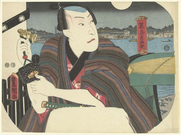 Curator: "Vrouw met waterpotten," or "Woman with Water Pots," created around 1850 by Utagawa Kunisada. It's a woodblock print, an exquisite example of ukiyo-e artistry, housed here at the Rijksmuseum. My initial feeling? Intimacy, somehow... It's softly vibrant despite its age. Editor: There's something quite intriguing about this portrayal. The way the artist presents this woman, it’s so deliberately posed yet retains a sense of her labor, her daily reality. The water pots next to the figure anchor her to that labor, of course. But also to the water they hold. Think of the essential, often gendered labor of fetching water, crucial for survival. And the symbolic properties that come with the waters in this scene - water to wash with, drink, and cleanse… how does it relate to representations of women in Japan at this time? Curator: Indeed, the water pots do function symbolically, anchoring her to that daily life, but also adding to a richer emotional depth. Water is purity, but also depth and mystery. Think about Shinto purification rituals. What does the pattern on the water bucket itself suggest to us? It feels significant. Waves and currents have psychological weight; think of turbulence and stillness as states of mind. Editor: But considering the context of the Edo period and the burgeoning merchant class that Utagawa catered to, shouldn’t we examine how the artist depicts the woman herself? Is she empowered, constrained, idealized? The woodblock prints could certainly uphold strict standards but also introduce an alternative portrayal for some groups of women. Is she perhaps pushing back on idealized roles prescribed by societal norms? Is the labor she undertakes elevated or is it undermined? It matters to also think about which gender and economic strata produced and viewed these images at this time, to reflect on the historical circumstances of this artwork and what kind of messaging about class and gender was at play here. Curator: Absolutely. It’s a dynamic tension. Utagawa captures an ideal but within the reach of a person performing this work; there’s dignity alongside domesticity. The medium too lends itself to the tension we are describing. The stylization and color palette elevate a familiar scene. Woodblock printing made art accessible. The layers of meaning intertwine like the colors on the print. We are not simply admiring a domestic figure - rather a representation of female virtue rendered in the form of ordinary people. Editor: Yes, perhaps we both come away understanding better the complex messaging that surrounds this image of a woman laboring in this cultural moment. I see the push and pull more clearly now. Curator: Me too. It reveals a connection, perhaps, with something quite ancient. The archetypal figure of the water carrier connects the woman and the society to deeper shared symbolisms of virtue, survival and life.