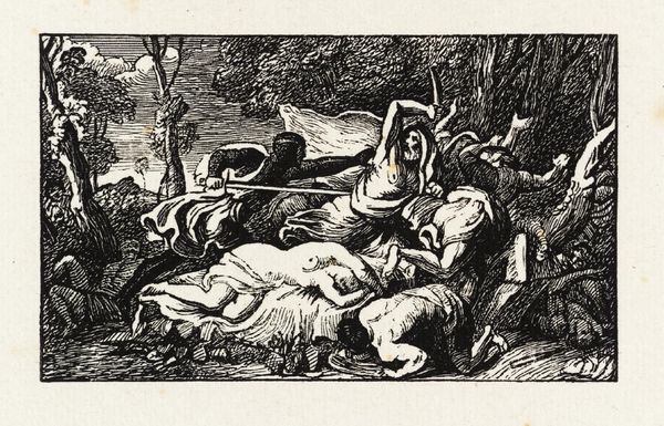 Curator: Looking at Edward Calvert’s “Ideal Pastoral Life,” a print reproduced for Calver's "Memoir" in 1904, the use of line and light creates such a unique atmosphere. It's currently held in the collection of the Metropolitan Museum of Art in New York. Editor: It feels like stepping into a dream, doesn’t it? A soft, drowsy kind of dream where everything is rendered with the deepest contrasts, like a woodcut illustrating a forgotten myth. Curator: The medium, ink on either drawing or print—creates such strong contrasts. Considering its time, let's consider Calvert's access to resources, his studio setup. Prints at that time democratized art; this piece could reach a wider audience than a painting. What labor went into this distribution? Editor: Oh, absolutely! The social reach speaks volumes. And the labor, the hand involved...it feels like a direct imprint of Calvert’s soul, those sharp, deliberate lines hinting at a landscape both serene and subtly charged, kind of resonating, don’t you think, with a Blake-like intensity, an echo of Romanticism's yearning for nature and the ideal? Curator: I see your Blake comparison. He also tapped into these utopian landscapes, a retreat from the industrializing world. The sheep here almost look like clumps of wool. Notice the lines in the trees; the way they form, are not trying to capture reality in a mimetic way, but more how materials are placed to make certain affects. What materials did he have on hand and why? Editor: Precisely. It's the economy of expression that really moves me—like a haiku captured in ink. What can you evoke with the most efficient mark? The sensuality of it all: the smooth skin of the shepherds against the woolly sheep...it's a study of textures and desires. Is this the art equivalent of free-range living, yearning for that simpler mode of material consumption? Curator: I like that notion of 'free-range' living you raised. Perhaps there's something to glean, a sense of resisting the mass production era— advocating a more artisanal approach not just to art making, but living as well. Editor: Absolutely, it feels incredibly vital now. It invites you into its idyllic dreamscape, to just linger and reflect... Curator: ...And to consider the context that enabled this particular type of production, it might spur an awakening toward the world we're actively constructing for others. Thank you, I like what the image and conversation stirred.