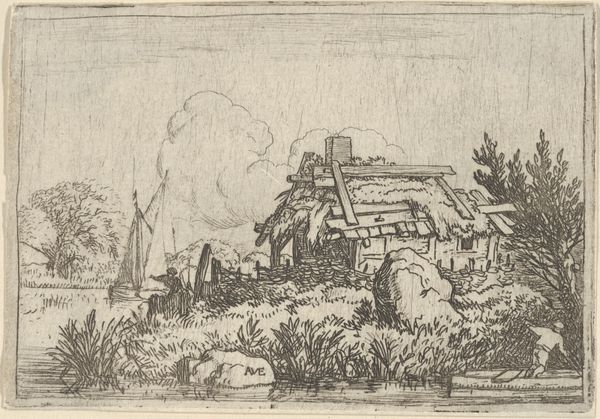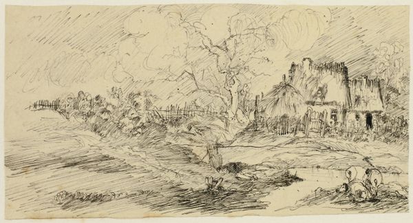 Curator: Rodolphe Bresdin's "The Farm," dating somewhere between 1822 and 1885, is an etching brimming with intricate detail. Editor: My first impression is one of dense, almost claustrophobic detail. The texture created by the etching is so rich, it feels almost overwhelming. Curator: Indeed, Bresdin's technique is extraordinary. This print captures a rural scene, yet it seems to hint at larger socio-economic structures, at agrarian labor and the peasant class—at the lives tethered to the land. Think about how limited resources affect people. Editor: It is striking how the varying line weights articulate form and space. Look at the contrast between the delicate hatching of the sky and the bolder, more defined lines that create the forms of the buildings and figures. It adds incredible depth. Curator: Considering his personal life, which was marked by poverty and marginalization, it’s tempting to see "The Farm" as a representation of the often romanticized but also difficult reality of rural existence. Bresdin's experiences deeply colored his art. Editor: And how cleverly the artist used light and shadow to direct the viewer's eye! From the darker, more concentrated lines in the foreground to the gradually lighter tones toward the horizon. The composition itself contributes to the narrative. Curator: It speaks, perhaps, to a longing for simpler times, but also to an acknowledgement of the back-breaking work required. This tension between idyllic vision and lived experience defines the complexities of class relations. Editor: This focused view allows a greater sense of its compositional and textural intricacies, wouldn't you agree? I'm left to ponder the sheer level of precision involved in its execution. Curator: I agree. Through its sharp detail, "The Farm" gives us more than a glimpse into a rural scene. It urges us to examine the unseen forces shaping individual lives, asking critical questions of the societal norms. Editor: The stark lines and thoughtful structure offer a compelling image. Curator: Precisely. It allows the work to speak about historical narratives relevant even now.