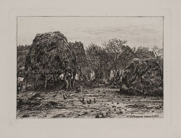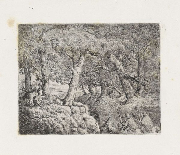 Editor: This is Mary Nimmo Moran's etching, Solitude. The intricate lines create a dense, almost claustrophobic, forest scene. I’m struck by the labor involved in producing such detail. What can you tell me about the process and its impact? Curator: The etching process itself is crucial. Think about the physical act of repeatedly applying acid to the plate. Moran, a woman in a male-dominated field, actively engaged in this demanding work. How does her engagement with the physical process of etching challenge our perception of landscape art? Editor: That makes me consider the market for prints at the time and how it democratized art ownership. Thank you. Curator: Precisely! By analyzing the materials and means of production, we see how this seemingly tranquil scene is tied to broader economic and social forces.