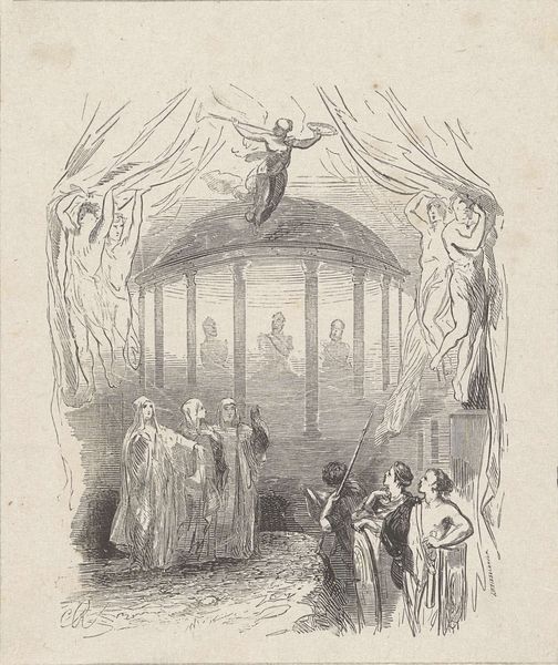 Curator: This is "Seeing the Old Year Out - Watch Night," designed by Winslow Homer. It is currently housed in the Harvard Art Museums. Editor: What strikes me first is its division—domestic festivity sharply contrasting with the somber assembly in the church. Curator: Indeed, the composition reflects a duality—observe the line bisecting the revelry and the prayer. It's a formal device, mirroring the societal layers depicted. Editor: Beyond composition, the material context matters. Printed in Harper's Weekly, this image speaks to wider social practices and the industrial means that brought these scenes into homes. Curator: The figures above suggest a hopeful, ethereal anticipation—a counterpoint to the earthbound materiality you emphasize. Editor: I see it also in terms of the labor to create such imagery for mass consumption and how it shapes our understanding of leisure and worship. Both capture the temporal anxieties of an ending. Curator: A compelling point—the interplay between the spiritual and the material.