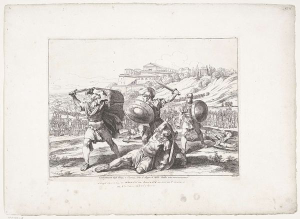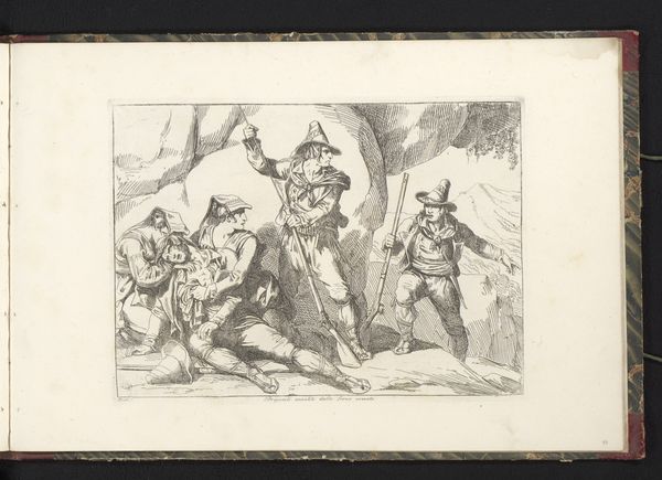 Bartolomeo Pinelli created this etching, "Bandieten worden gewaarschuwd," in Italy sometime in the early 19th century. The image depicts a group of bandits being warned of approaching danger, perhaps soldiers or other authorities. In Pinelli's Rome, banditry was a complex social phenomenon, blending criminality with elements of popular resistance against the state. The image uses a visual language rooted in the romanticization of rural life and the figure of the "noble savage." The bandits, though outlaws, are presented with a certain dignity and ruggedness. The woman warning them adds a layer of moral ambiguity, suggesting the bandits might have local support or protection. To fully understand this etching, we would need to delve into the history of the Papal States and the social conditions that gave rise to banditry. We can investigate the popular culture of the time, looking at folk songs, literature, and other visual representations of bandits. This will all help us to understand the politics of imagery and the social conditions that shape artistic production.