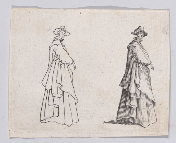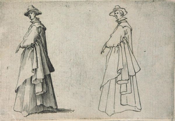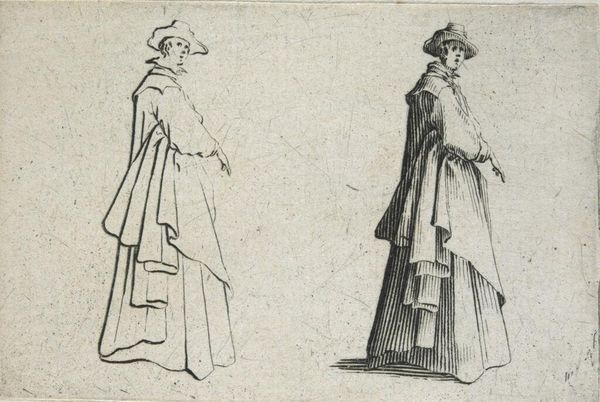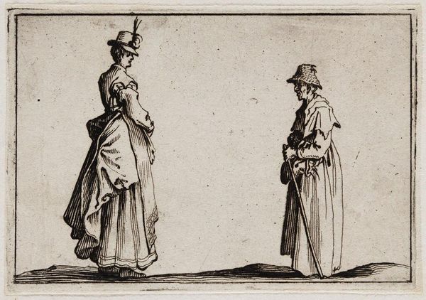 This print, "Copy of Deux Femmes de Profil" from "Les Caprices," presents us with a striking contrast between two women. The iconography of the figures is deeply embedded in social symbolism. One woman, modestly dressed with a walking stick, perhaps signifies age or poverty. The other, adorned with an elaborate hat, suggests wealth and status. Consider how the walking stick held by the woman on the left echoes the scepter, a symbol of power seen in countless royal portraits through the ages. Yet, here, it is transformed—a mundane tool rather than a symbol of authority. This juxtaposition reminds us of the cyclical nature of symbols, how they reappear across time, altered but never entirely divorced from their original meanings. The contrast between the two figures may evoke a psychological tension, stirring collective memories of social hierarchies and personal aspirations, engaging us on a subconscious level. These visual contrasts provoke an emotional response, drawing viewers into a deeper contemplation of social roles. The motifs we see here are not static; they are living entities, evolving and adapting through the currents of history.