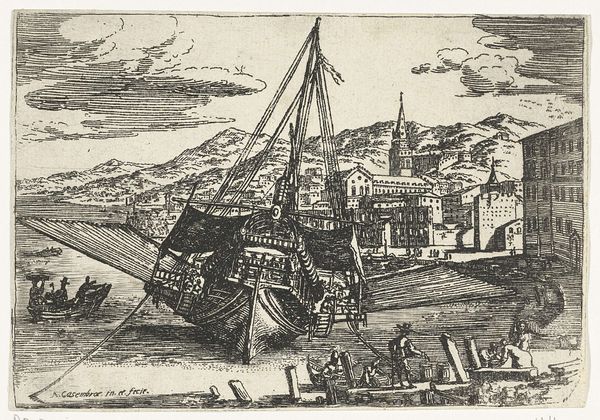 Curator: Looking at this woodcut titled "Sunday on the Waterfront" from 1936 by Charles Frederick Surendorf, the first thing that strikes me is its stillness. Editor: Stillness? I see more a pervasive tension! The sharp, angular lines give everything a sense of unease, from the rippling water to the reclining figure. Curator: Indeed. The formal qualities definitely amplify the mood. I see the artist using the stark black and white contrast of the woodcut medium to enhance a kind of urban languor amid economic strain. Editor: Absolutely. Consider Surendorf's choice of woodcut. The process is laborious, each line carefully carved—reflecting the labor inherent in a waterfront community during the Depression. And let’s think about consumption: prints make art accessible and reproducible for the masses, not just a select few. Curator: A crucial point. Furthermore, observe the composition—how the artist situates the resting figure in the foreground, seemingly disconnected from the bustling city skyline and industrial activity of the port, emphasizes an individual's isolation perhaps representative of that era. Editor: Yes, but it’s also visually clever! The figure mirrors the hard angles of the pier, almost becoming one with the environment, while the boat embodies motion; and consider, too, that this juxtaposition of active and inactive draws my eye across the landscape as surely as a carefully-staged painting does. Curator: So true. There is almost a photographic sense to it; like a snapshot of working class life and leisure at that particular historical intersection. The city itself acts like an observing crowd far removed from the daily concerns of those who toil there. Editor: Exactly! It's an astute artistic commentary that acknowledges a cultural milieu, offering insight to the working lives of countless citizens. A true testament to its time. Curator: Ultimately, it is amazing how Surendorf created an intricate visual record of the city, labor and social dynamics all from simple but intentional incisions in wood. Editor: Agreed. His mastery is evident, both materially and formally, transforming a potentially bleak image into a reflection on human persistence and artistry.
