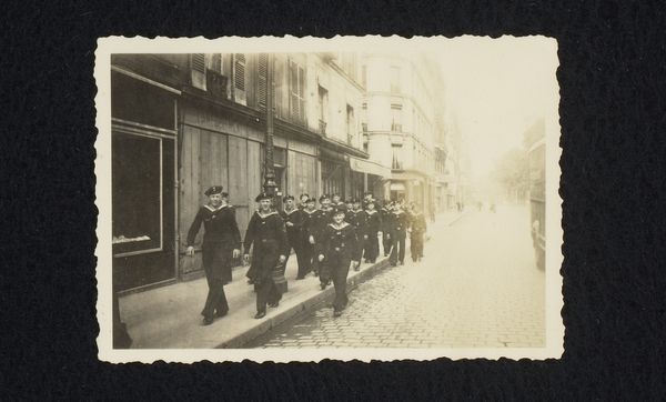 Here we see six sailors captured in a photograph, strolling along a shop-lined street, frozen in time. Their uniforms, each a near echo of the others, speak to a collective identity, a banding together. Consider how the attire of sailors, with its deep historical roots, evokes a sense of shared experience across generations. These uniforms are not merely clothing; they are symbols of duty, adventure, and a connection to the sea. One might recall similar group processions in Renaissance processional friezes, where figures, identically dressed, move with purpose. The coordinated dress suggests order, structure, and a sense of belonging. Yet, each sailor maintains his individuality, hinted at by slight variations in posture and expression. This tension between conformity and individuality is a powerful force. Think of it as a dance between the conscious desire to belong and the subconscious urge to assert one's own identity. Such images resonate deeply, tapping into our own complex relationships with group identity. The rhythm of cultural memory, ever-present, resurfaces in these young men.