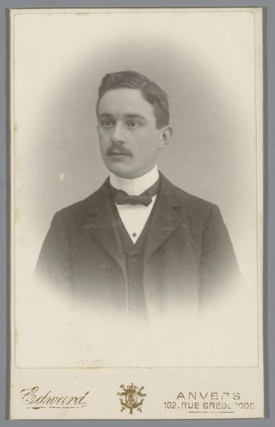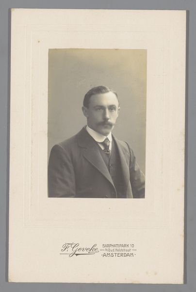 Editor: Here we have an intriguing photograph, "Portret van een onbekende man," created between 1875 and 1900 by Johannes Leonardus van der Heijden, a gelatin silver print. The portrait’s serious tone feels very characteristic of photography from that period. What social context can you provide for understanding its appeal back then? Curator: This gelatin-silver print speaks volumes about the evolving role of photography in late 19th-century society. As photography became more accessible, portraits like these democratized image-making, no longer solely reserved for the wealthy elite who could commission painted portraits. What’s particularly compelling is the photographer's stamp at the bottom -- "Johs. L. vd. Heyden," including his address. Editor: So, in effect, it's advertising, too? Curator: Precisely. Studios leveraged these prints for marketing, distributing them as calling cards. Consider how this challenges our conventional notion of "art." The work straddles artistic expression, commercial enterprise, and social documentation. It raises questions about representation and the power dynamics inherent in image creation and distribution at that time. Editor: It's amazing how much one can unpack from a single photograph when considering these angles. I hadn't considered it as a kind of business card at all! Curator: Absolutely. Analyzing how museums and galleries curate these portraits also offers a fascinating look into the ongoing construction of historical narratives. How do these seemingly commonplace images contribute to a broader understanding of 19th-century identity and culture? Editor: Thinking about it this way really makes history come alive. Thank you!