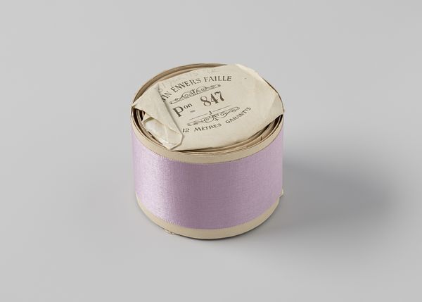 Curator: Looking at this serene composition, a photographic still life from around 1900 to 1915, titled "Lint van turkoois gaas" in Dutch, and residing here at the Rijksmuseum, my immediate thought drifts towards its cultural and commercial purpose. Editor: It does strike me as profoundly elegant, this ribbon—a tranquil band of turquoise—its gentle spiral under that aged paper label suggests both promise and preciousness. It brings to mind an older aesthetic ideal of practical refinement. Curator: Absolutely. The “10 Metres Garantis” declaration underscores consumer culture emerging at the turn of the century. This wasn’t just ornamentation; it was marketed quality, photographed perhaps for a catalog or advertisement. Editor: Indeed, and that particular shade of turquoise itself…it's fascinating how colors carry meaning across time. Turquoise often represents serenity, healing, and protection. Imagine what this color may have symbolized for potential buyers during a more chaotic era? A reminder of tranquil nature within the industrial age? Curator: It raises compelling questions about accessibility to luxury, too. How far would "10 meters garantis" of such material stretch, geographically and socially? Would it primarily adorn the elite, or did wider markets crave a touch of refined artistry? It serves also as a symbol for how commodities gain value via representation. Editor: A tantalizing proposition! These symbols extend far beyond material objects; it also speaks of the aspirational image many seek of themselves when making the purchasing choice of what beauty to associate with. The promise contained within, even. Curator: Yes! Thinking of it as an advertising tool, it definitely hints at emerging strategies that went into forming this image as an extension of identity. This studio shot would have had an outsize cultural resonance that has extended into today's market forces, with its implications and manipulations of meaning. Editor: Exactly, from just one seemingly simple roll. Its ripples reach beyond. Curator: Very true, this is so much more than just what it appears on the surface; these carefully arranged moments offer such incredible glimpses into culture. Editor: Agreed; each little detail here evokes the rich tapestry of cultural heritage behind our every day encounters and things.