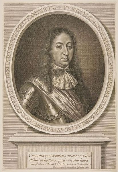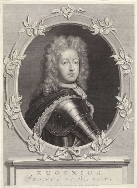 Editor: Here we have a miniature portrait titled "A Young Knight of the Garter, Possibly George Augustus (1683–1760), Later George II of Great Britain and Ireland," made sometime between 1701 and 1711 by Benjamin Arlaud. It has an ornate frame with a loop on top, suggesting it might have been worn as a pendant. As it is in black and white, it's difficult to discern mood; tell me, what key aspects or symbols do you notice in this work? Curator: Immediately, I'm struck by the circular form itself. A circle, repeated throughout history, often signifies completeness, eternity, and the cyclical nature of time. Then consider, within this bounded space, we have the youthful knight. Armor suggests strength and readiness for battle, of course, but here it is contrasted with delicate lace and the flowing wig. What emotions might that tension between masculine armor and aristocratic finery evoke, do you think? Editor: It’s interesting to consider that juxtaposition. It hints at the performance of power, maybe even anxiety, that his inherited social position has been earned and thus open to challenges. Curator: Precisely. And it makes me think about the function of portrait miniatures during this era. They served not only as representations of identity but also as intimate keepsakes. The symbols embedded in their creation held personal, social, and sometimes even political weight, passed down and shared through generations. What impact does knowing its use has a gift between lovers has in this era mean? Editor: That personal dimension changes everything; a token of love imbued with all this symbolic weight. The piece starts to feel quite psychologically complex, this tiny object loaded with so much. I never expected such depth from something so small. Curator: And it's in that intersection of personal meaning and grand cultural symbols that the true power of these works resides, continuing to speak to us across centuries. We glimpse both a person and an era concentrated in this tiny space.