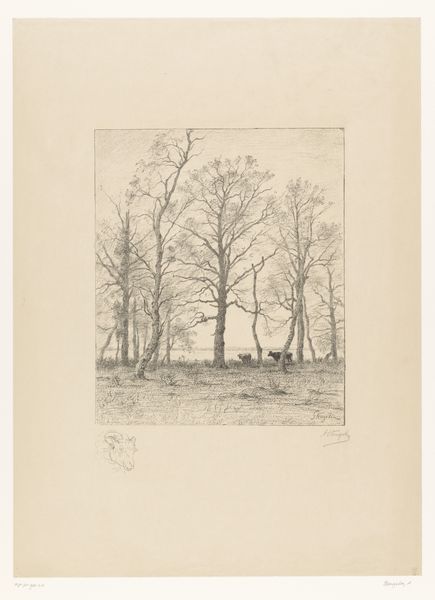 Wijnand Otto Jan Nieuwenkamp made this etching, "Twee zilverpopulieren bij Santpoort," depicting two silver poplars near Santpoort. Nieuwenkamp lived through significant social and political changes in the Netherlands, including the rise of industrialization and urbanization, which led to a growing interest in preserving rural landscapes. The etching demonstrates this interest in nature. In the context of Nieuwenkamp's time, this work reflects a nostalgic view of the Dutch countryside and an appreciation for its natural beauty. Although this work does not directly engage with gender, race, or class, the choice of subject matter – rural landscapes – is connected to historical and cultural values. The beauty and simplicity found in nature are emphasized as values. This emphasis on natural beauty creates a narrative of cultural identity which is rooted in the land itself. This etching, with its detailed rendering of trees, invites us to reflect on our relationship with the environment and the importance of preserving it for future generations.