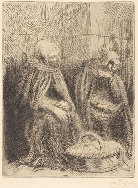 Editor: This is "Hiding the 'louis'" by Jean-Louis Forain, created around 1914 to 1919 using charcoal. It has a bleak and unsettling mood, and the figures seem so vulnerable. How do you interpret this work? Curator: Well, the most striking thing to me is how Forain uses recognizable symbols of the era – the soldiers' uniforms, the 'louis' coins possibly representing wealth or privilege - and twists them. Note how one soldier seems to be concealing another who’s strangely posed, like a mannequin. The mannequin itself wears what appears to be the helmet of the opposing army. Doesn’t that resonate with the psychological stress and moral ambiguities of wartime? Editor: It does, definitely! So, the hiding isn’t just physical, but maybe a hiding of allegiance or even identity? Curator: Precisely. Forain masterfully conveys the trauma and moral compromises of war by unsettling familiar visual cues. We, as viewers, grapple with this image, attempting to understand the "louis" – the thing that is precious or valuable - that needs to be hidden, the "why," and perhaps the betrayal in the act of hiding. Don't you find it asks questions about who is on whose side, and what value truly means when everything is in conflict? Editor: I never thought about the distortion of symbols expressing internal conflict, but that really sheds new light on this piece! Thanks. Curator: It's fascinating how these historical events are encoded through the transformation and layering of visual language, isn't it?