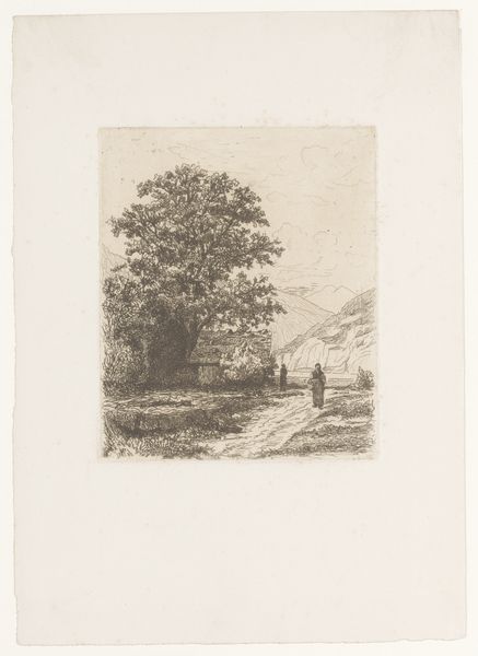 Curator: We’re looking at "The Tree with Many Birds" by Johannes Tavenraat. It was created sometime between 1819 and 1881 and resides here at the Rijksmuseum. It's rendered in watercolor and coloured pencil, evoking a sense of being painted en plein-air. What's your initial response? Editor: A gathering dusk, definitely somber. The large tree looms, and the birds swirl above like escaping thoughts or memories. The figures in the foreground seem small, almost swallowed by the landscape. Curator: Precisely, there's an undeniable sense of scale at play, but let's delve a little deeper into that ‘somber’ reading. Considering the era, we’re at the cusp of massive social upheaval. The positioning of those figures, seemingly excluded, almost in shadow, hints at class divisions, at the marginalized struggling for visibility amidst a rapidly changing social structure. Editor: Yes, the birds, particularly, pull at me. They represent the soul, freedom, aspiration… their departure en masse could signify societal unrest. But the tree! In many cultures, trees embody strength, wisdom, the interconnection of life – roots to sky. A haven even? Curator: Potentially, but that's where it gets complex. While the tree could offer shelter, its darkness and overwhelming size can also represent oppression, the entrenched power structures weighing down those figures below. Remember, landscape wasn't just backdrop then; it was a battleground for ideas about ownership, labour, and belonging. Editor: A valid point. Thinking about the Romantic period though, perhaps it speaks to something deeper—the sublimity of nature overpowering mankind? The human spirit confronted by something ancient and immense? Curator: I think those two concepts aren't mutually exclusive. What Romanticism revealed to us was how people understood those issues of power through those lenses of "natural beauty." Here, this "beautiful" tree also tells of displacement. I wonder, if these working-class families could speak, what narratives of resilience and resistance might they provide about their social and natural environments? Editor: The sheer amount of readings from this watercolor drawing of Tavenraat are compelling. It invites a meditation of personal memory and the weight of a complicated cultural past. Curator: It's a powerful reminder that art acts as a mirror and a lens, simultaneously reflecting and refracting the realities of its time, while still speaking across generations.