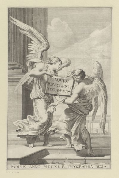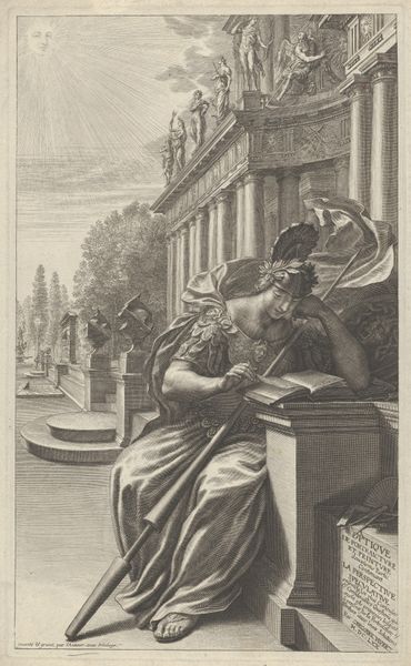 Editor: Here we have Claude Mellan's engraving, "Apollo met een amor," from 1638. I’m struck by the incredibly fine lines and how they create a sense of depth, even though it’s just black and white. What details stand out to you the most? Curator: Look closely at how Mellan has used a single, uninterrupted line to render the entirety of Apollo's face. It’s a bravura demonstration of technique, a direct challenge to established modes of engraving which relied on hatching. This wasn't just about depicting Apollo, but about showcasing the material possibilities and pushing the boundaries of the engraving process. The labor involved in creating such detail speaks to a deliberate blurring of the line between high art and the work of craft. Editor: That’s amazing, I didn’t realize it was a single line! What about the book or paper Apollo is holding—does that add another layer of meaning? Curator: Precisely. The inscription “Les Amours de Tristan” adds another layer. Consider this in the context of 17th-century printmaking, where prints like these were both artistic expressions and commodities, made and sold in workshops. Mellan may have made it for an edition of Tristan and Isolde, tying the mythological Apollo to romantic literature, demonstrating its commercial function beyond just its artistic value. Editor: So, it’s not just the image itself, but also how it was made and disseminated that’s important? Curator: Exactly! How materials were sourced, how workshops were organized, who the audience was—all these factors inform our understanding of the work far beyond traditional art historical concerns. What’s your takeaway from considering the image and its production? Editor: I think I now have a fuller understanding of the art. The focus on material creation enriches how we interpret an image, it is not separate, as I previously thought. Curator: Agreed! And considering art this way makes us ask essential questions about artistic intent and the realities of production.